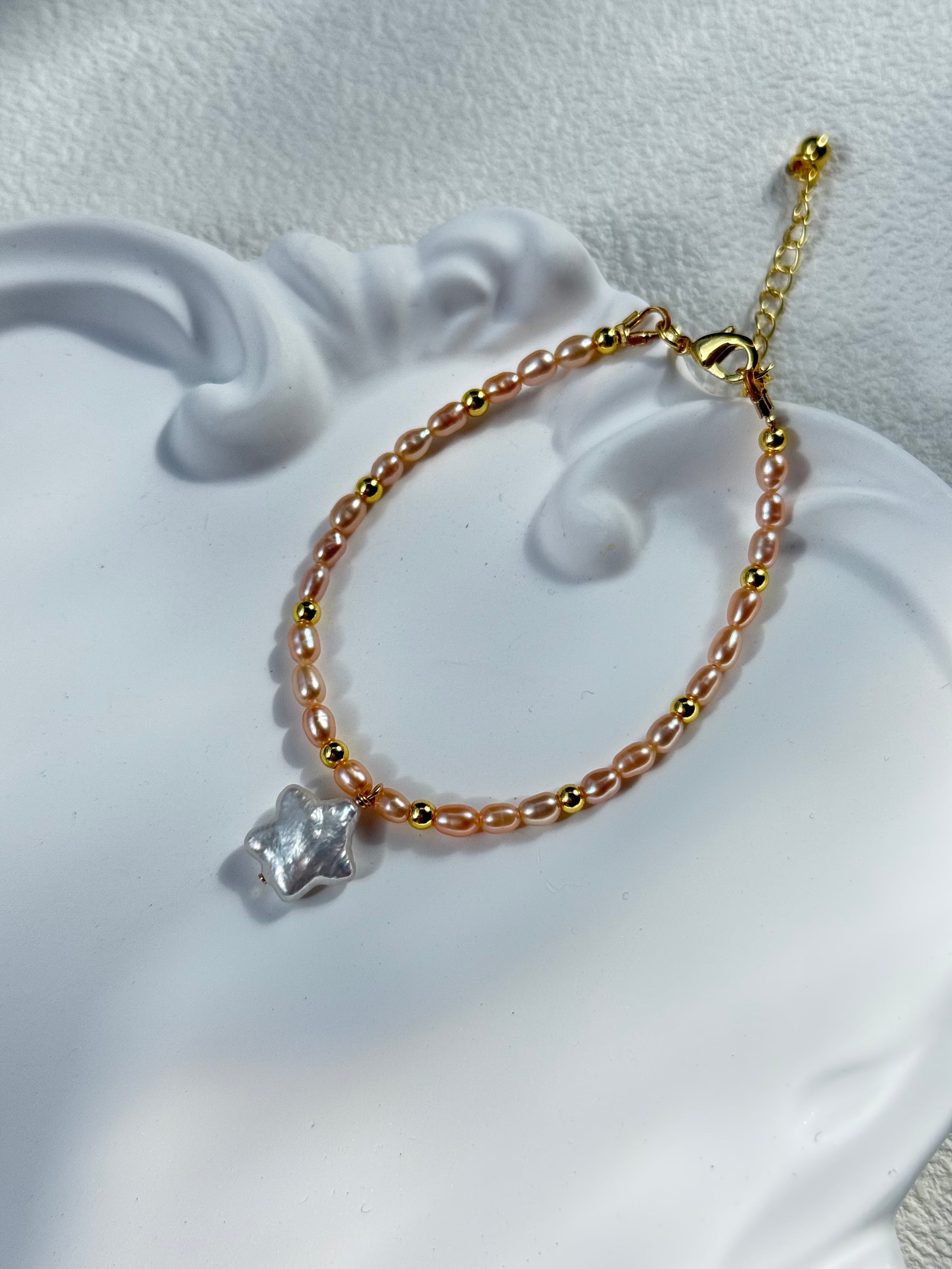 Lightweight and comfortable, it’s perfect for daily wear or gifting to someone special. The warm pink tones and natural star-shaped pearl make it a versatile piece that can be worn alone or layered with other bracelets.