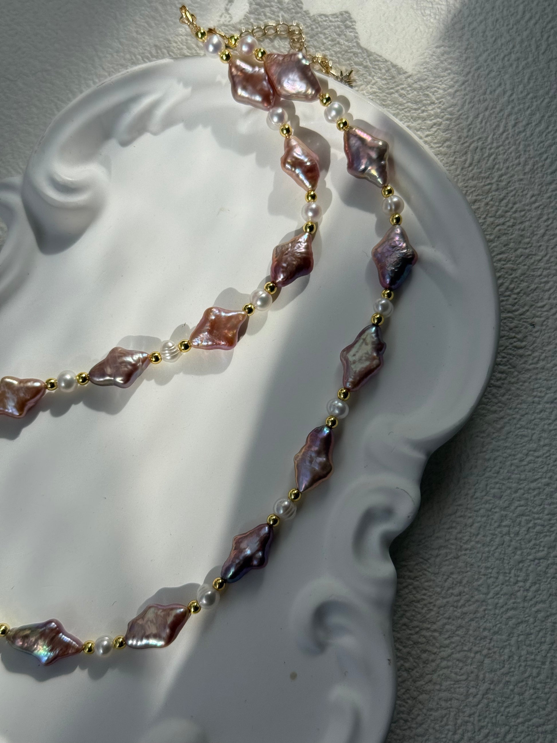 This stunning set features rare purple cross-shaped baroque pearls, shimmering with an iridescent glow that shifts between lilac and deep violet under the light. Paired with white freshwater pearls and 18K gold-filled beads, the design balances elegance with a celestial, statement-making style.