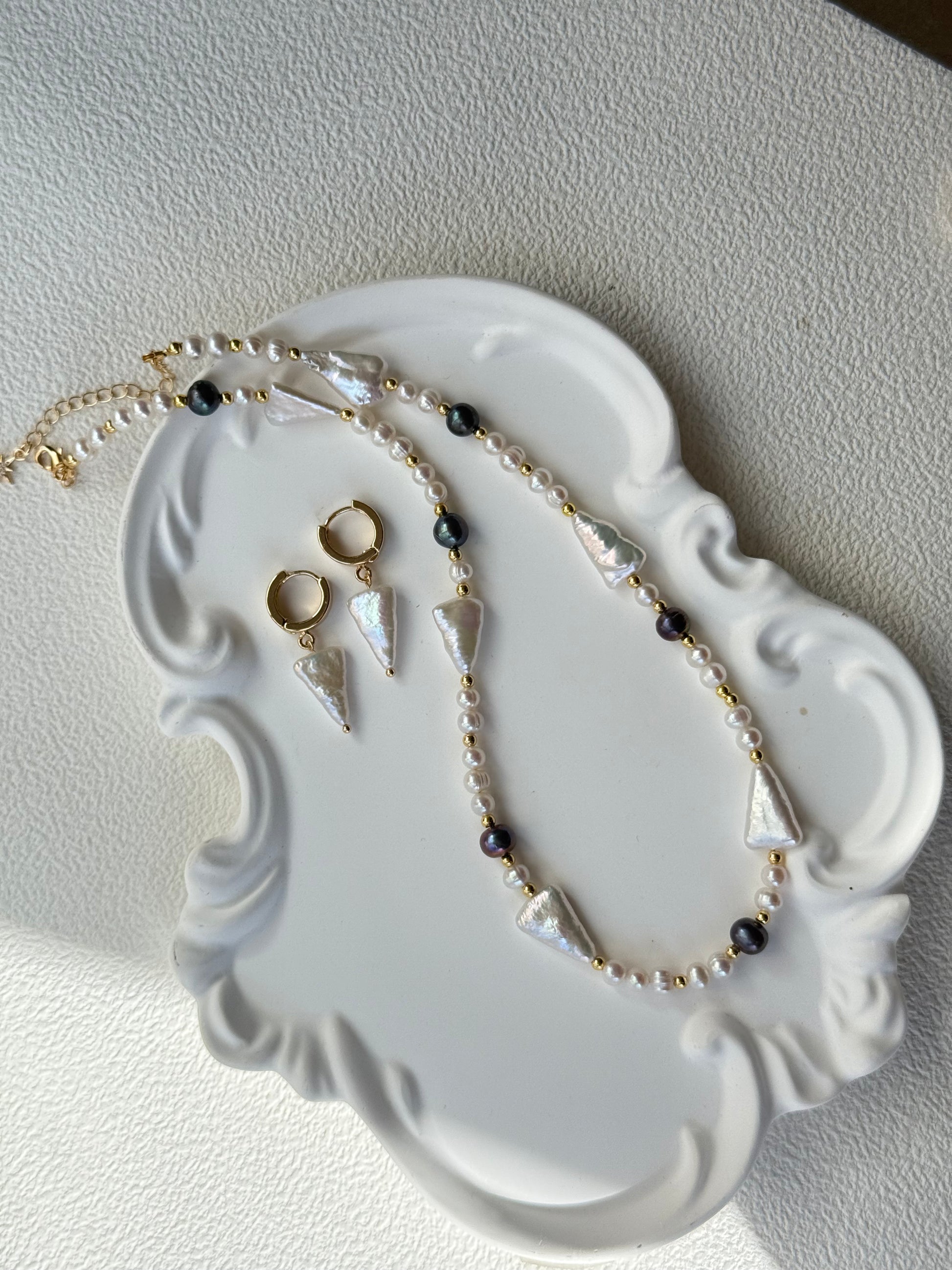 This unique jewelry set features a bold yet elegant design with triangle-shaped white freshwater pearls, paired with luminous black pearls, delicate white round pearls, and 18K gold-filled accents. The geometric pearl shapes give the set a modern, artistic edge while keeping its timeless elegance.