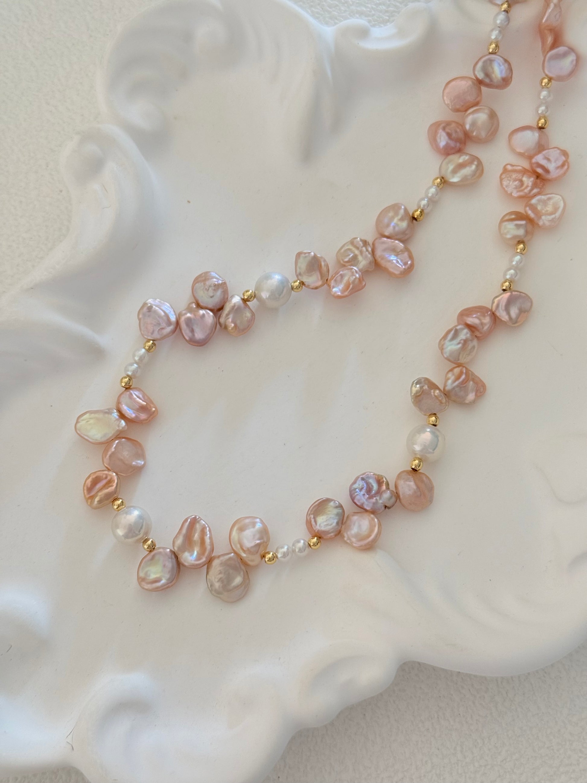 A dreamy strand of blush-toned freshwater pearls, shaped like delicate flower petals and softly glowing with natural iridescence.