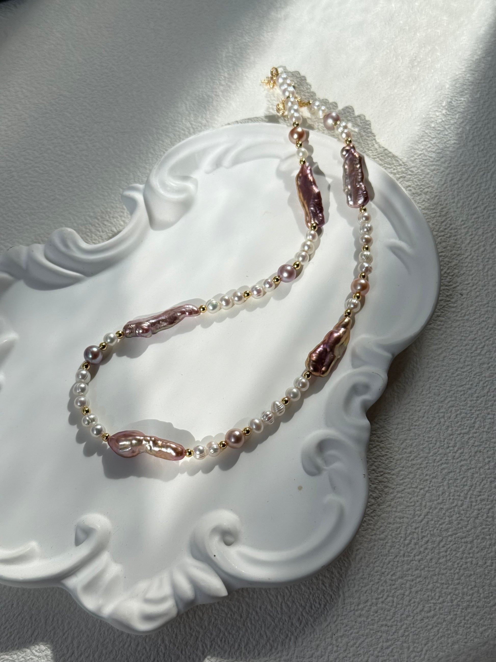 This elegant necklace features a beautiful mix of luminous white freshwater pearls and lilac baroque pearls, accented with 18K gold-filled spacer beads for a refined touch. Each baroque pearl is naturally unique in shape, giving the necklace an artistic and one-of-a-kind charm.
