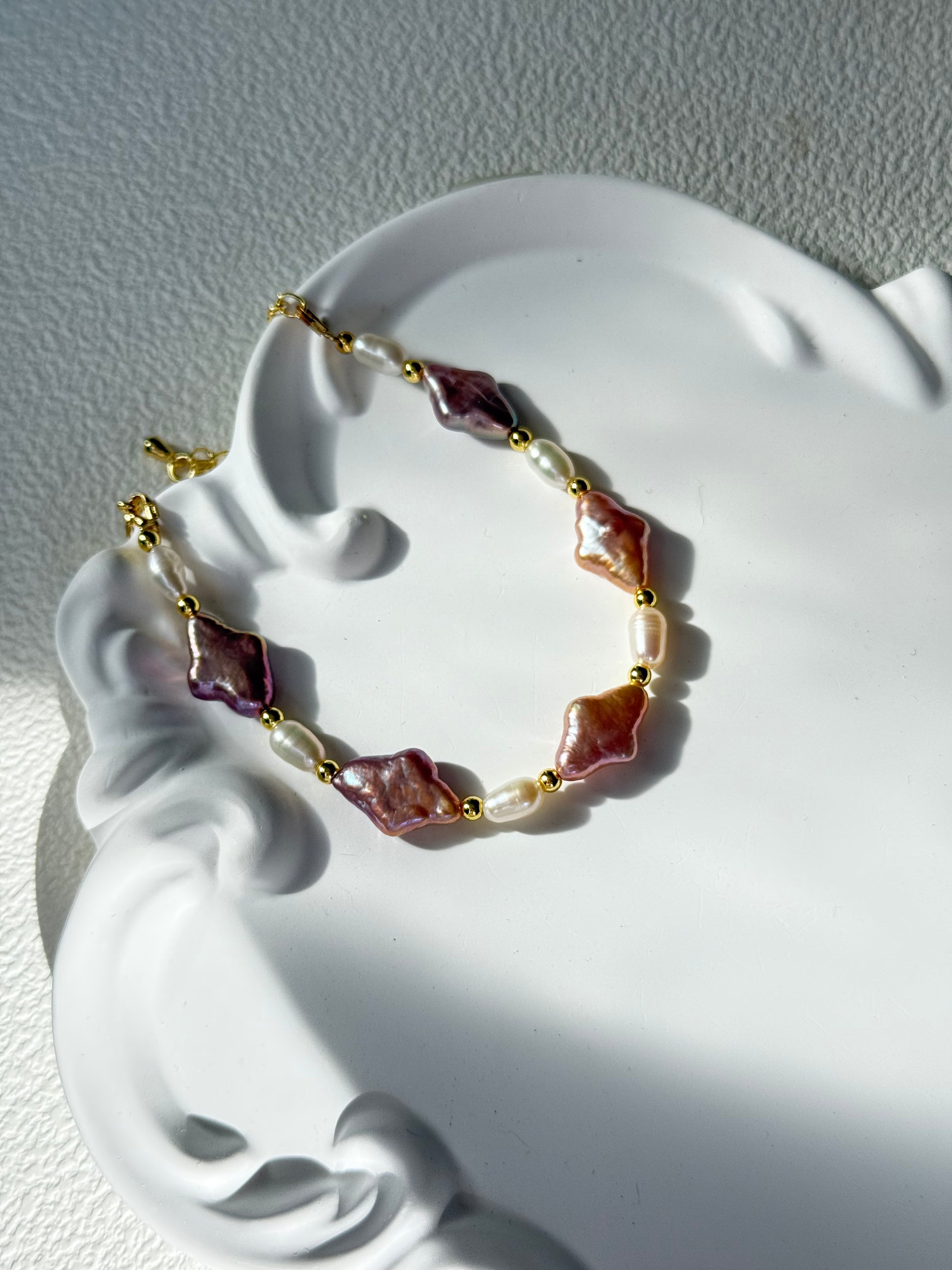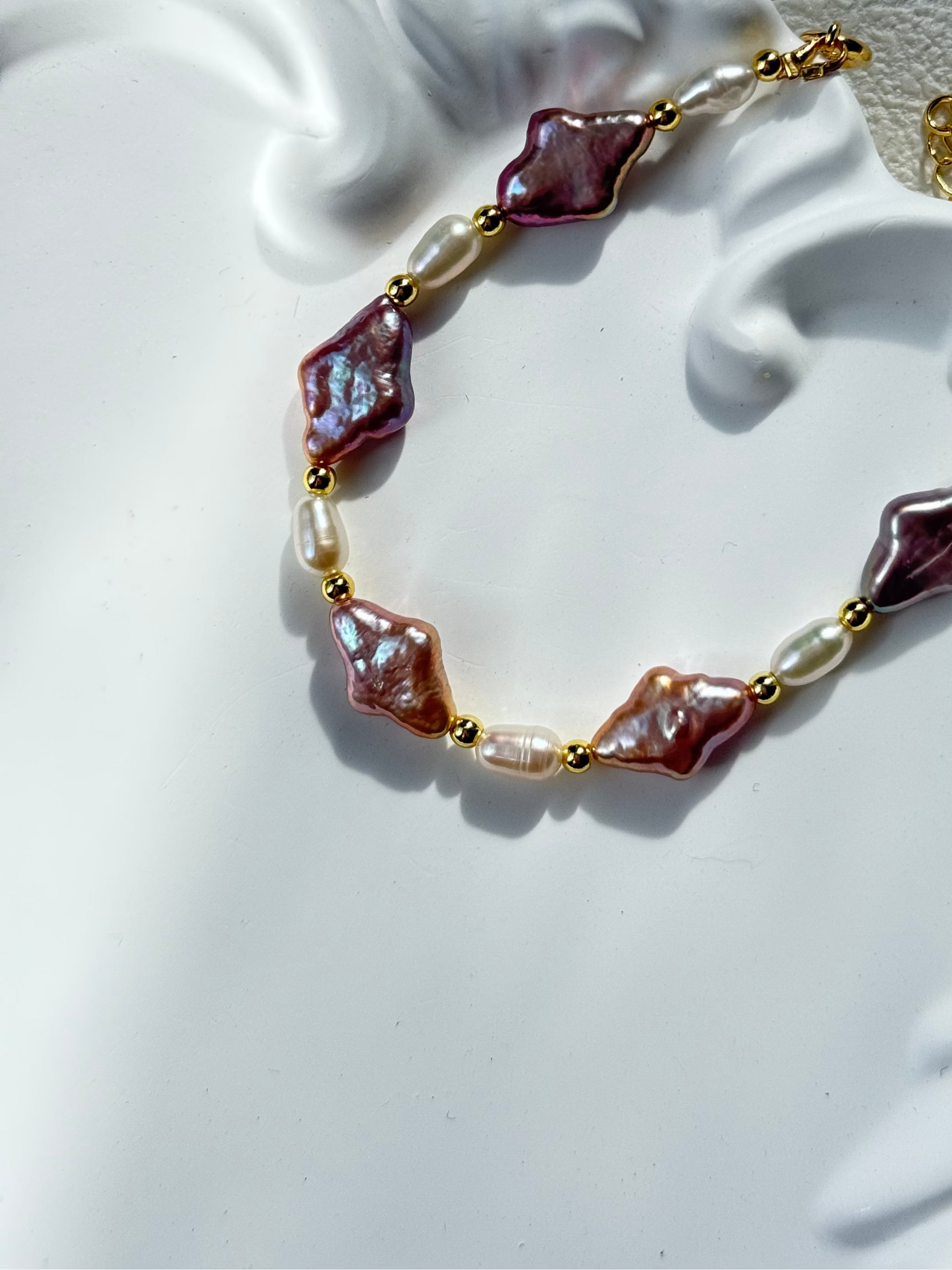 Elevate your style with our Baroque Diamond-Shaped Pearl Bracelet, featuring stunning purple and white natural pearls in a unique diamond silhouette. Paired with lustrous rice pearls and gold-plated accent beads, this bracelet offers a chic blend of elegance and personality.