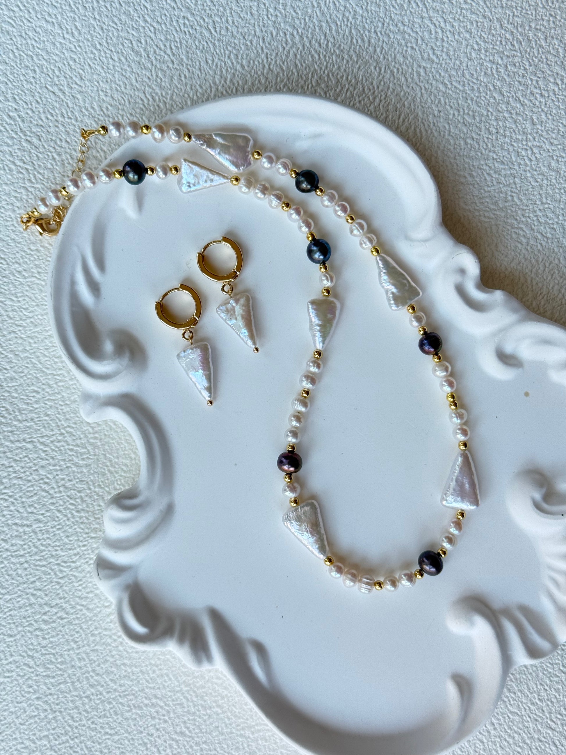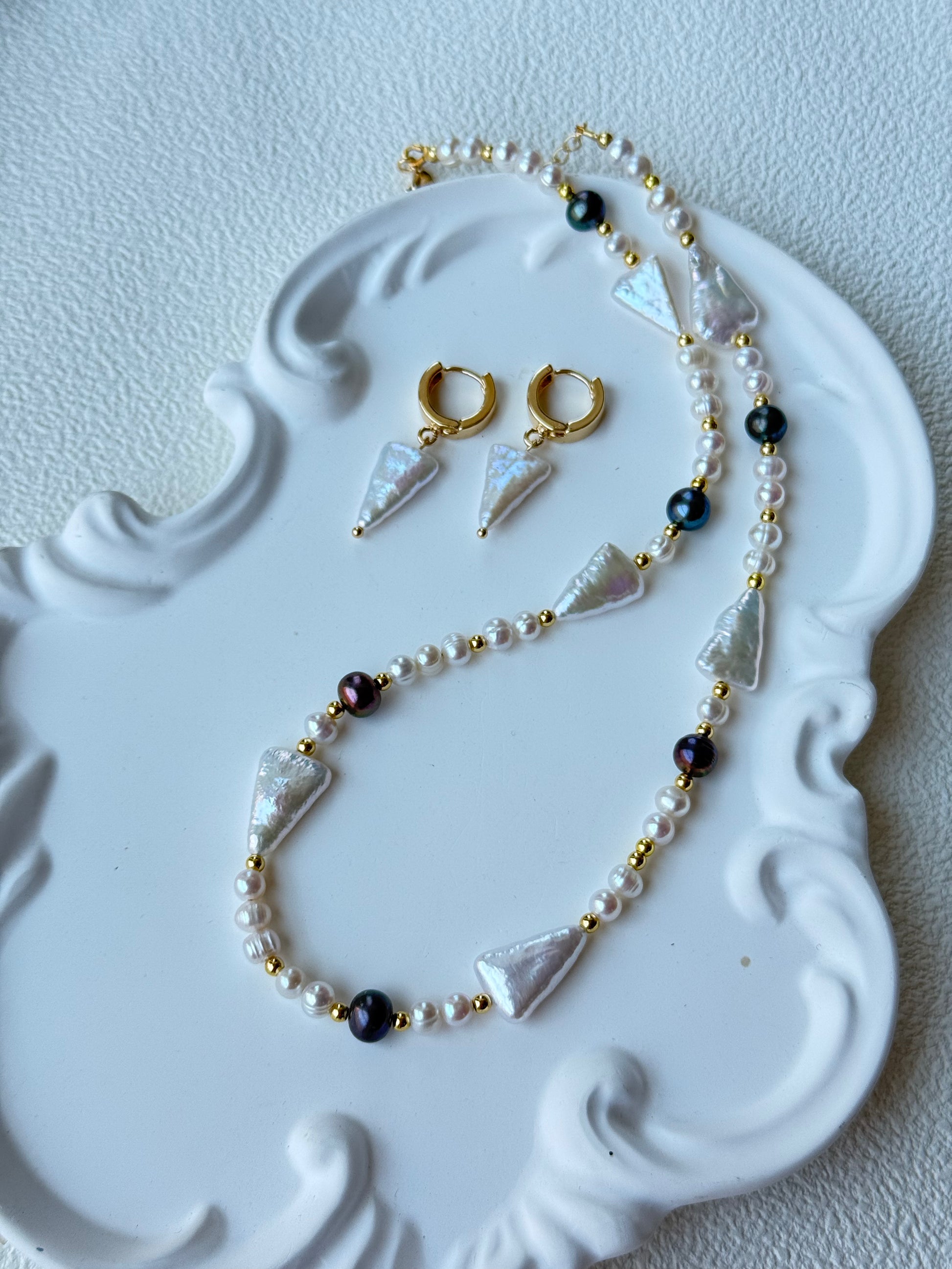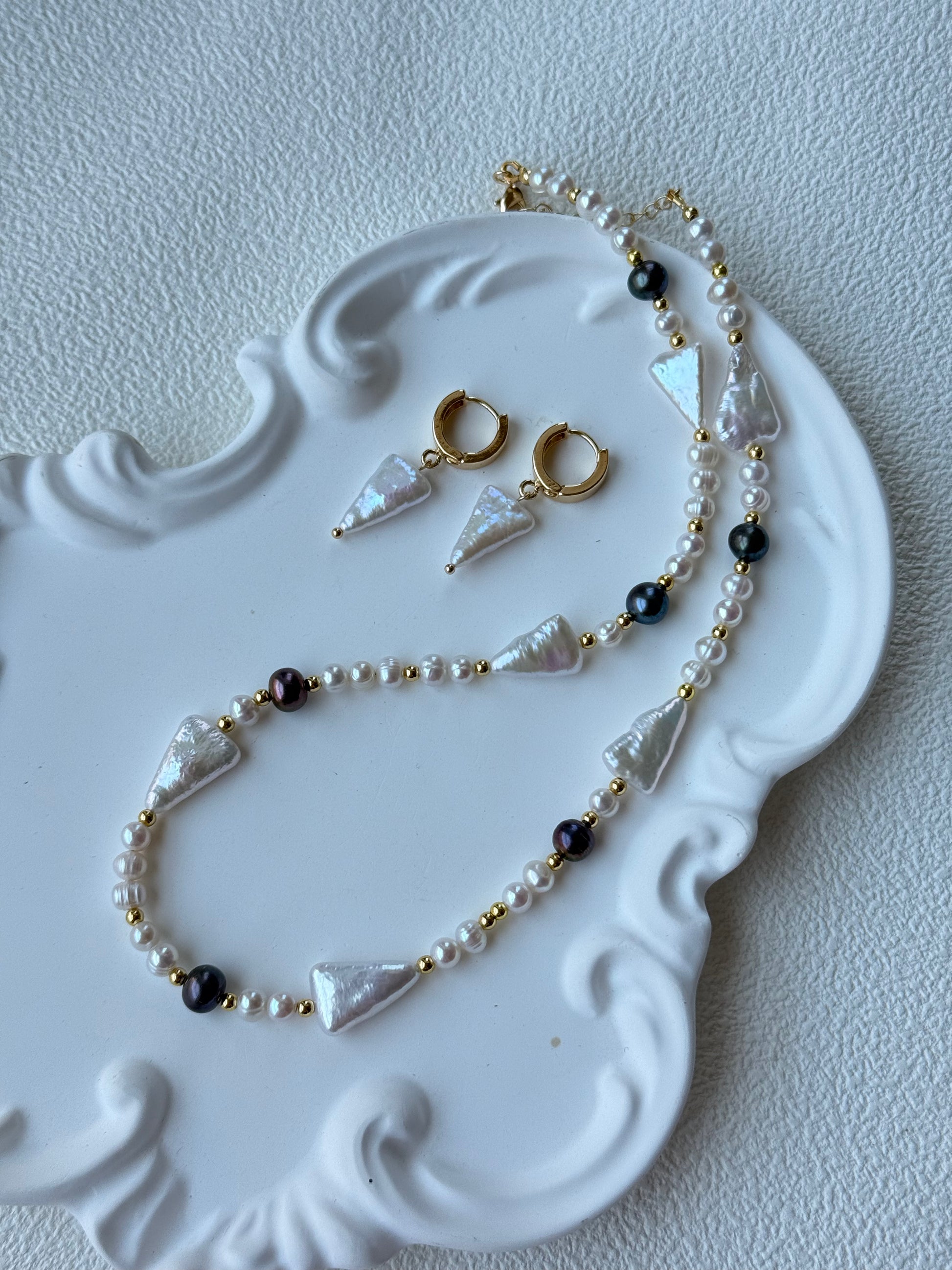 This unique jewelry set features a bold yet elegant design with triangle-shaped white freshwater pearls, paired with luminous black pearls, delicate white round pearls, and 18K gold-filled accents. The geometric pearl shapes give the set a modern, artistic edge while keeping its timeless elegance.