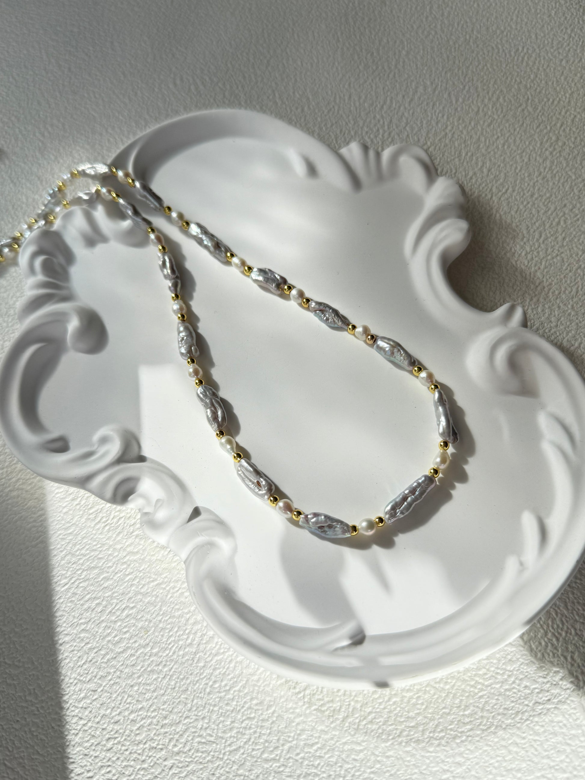 Make a subtle yet striking statement with our Grey-Blue Baroque Freshwater Pearl Necklace. Featuring elongated baroque freshwater pearls in a unique grey-blue hue, accented with gleaming gold-plated beads, this piece blends modern elegance with natural artistry.