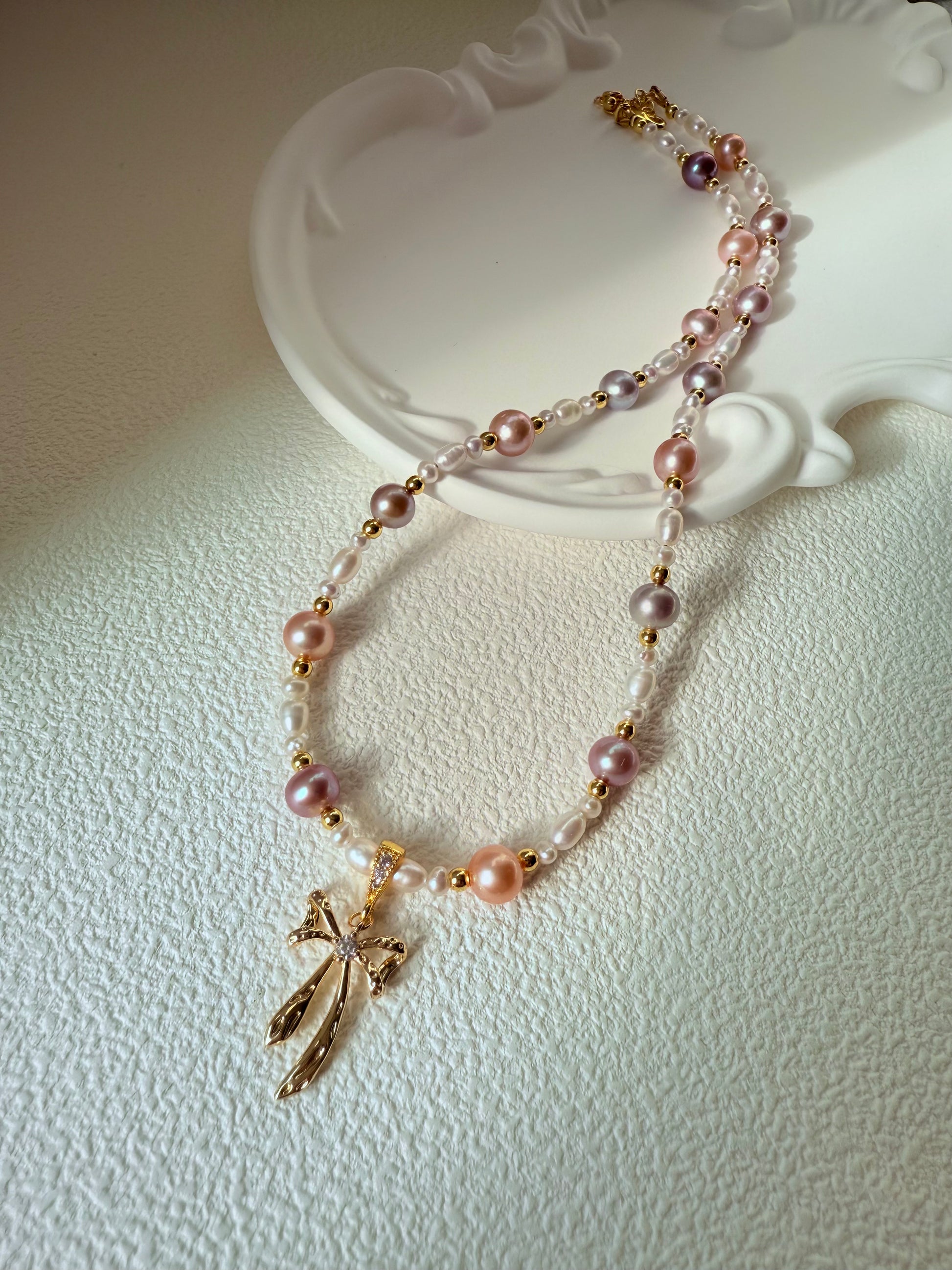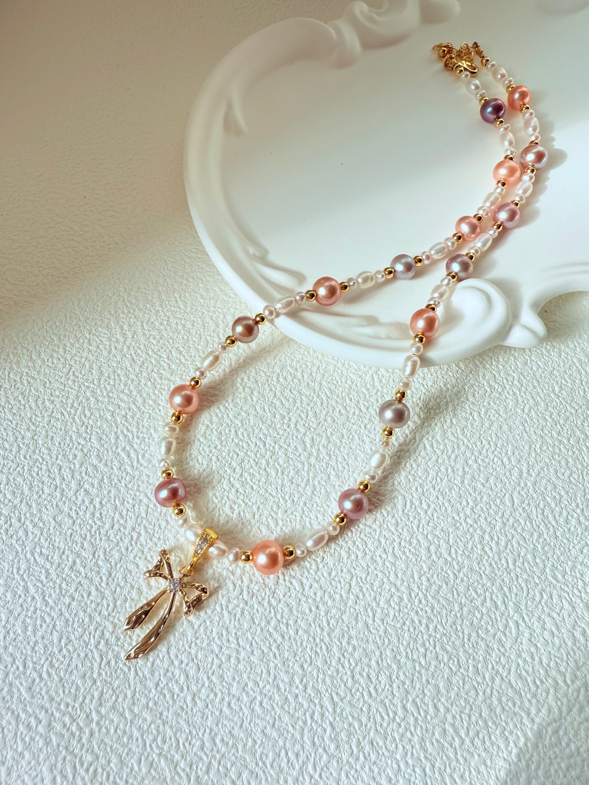 Elevate your style with this Multi-Color Freshwater Pearl Bow Necklace, featuring a charming gold-plated bow pendant and a string of lustrous pearls in soft lavender, peach, and white tones. Each pearl is naturally unique, giving this necklace a timeless yet playful elegance.