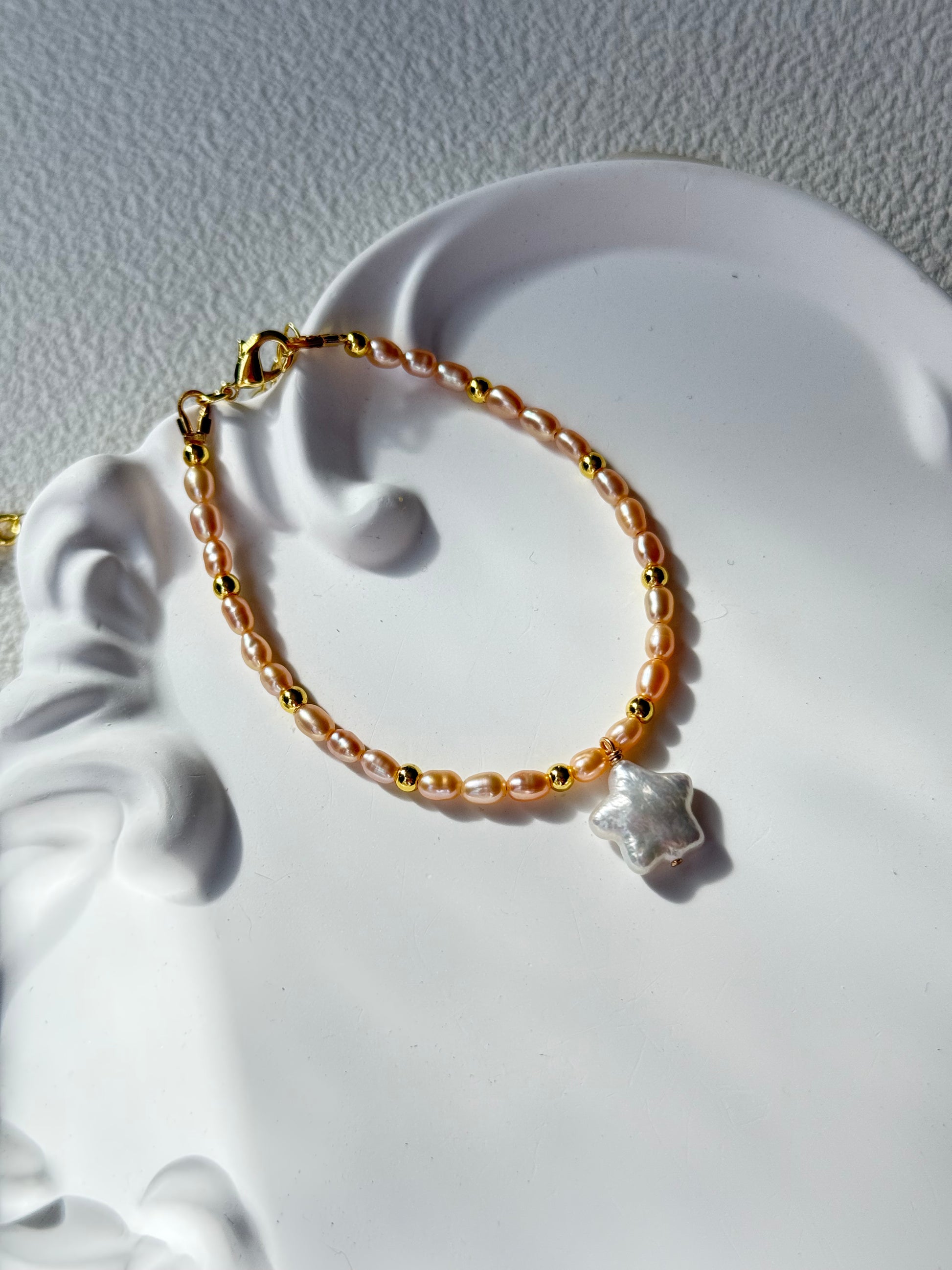 Lightweight and comfortable, it’s perfect for daily wear or gifting to someone special. The warm pink tones and natural star-shaped pearl make it a versatile piece that can be worn alone or layered with other bracelets.