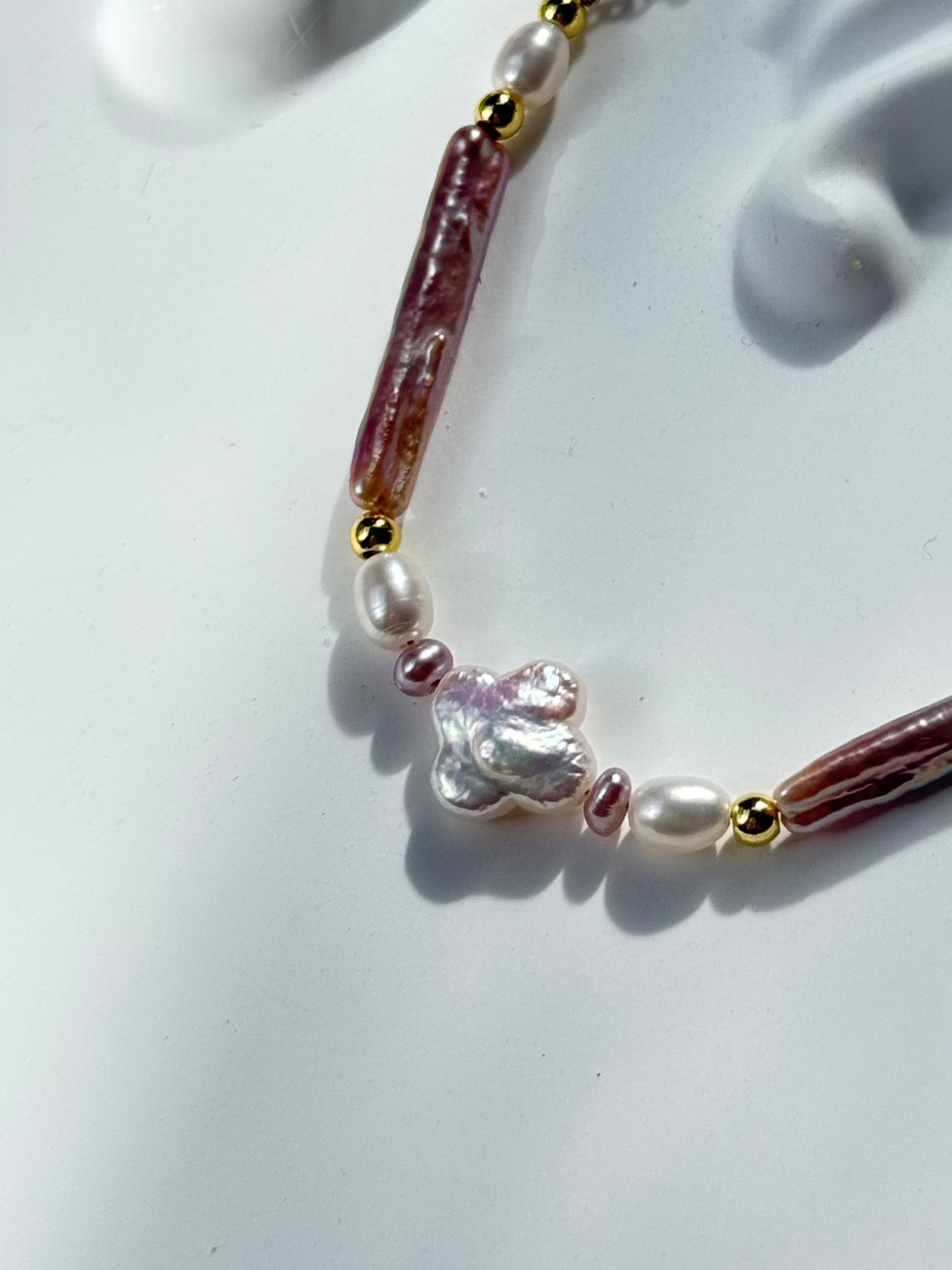 Material: Purple baroque freshwater pearls, four-leaf clover pearl, gold-plated alloy beads