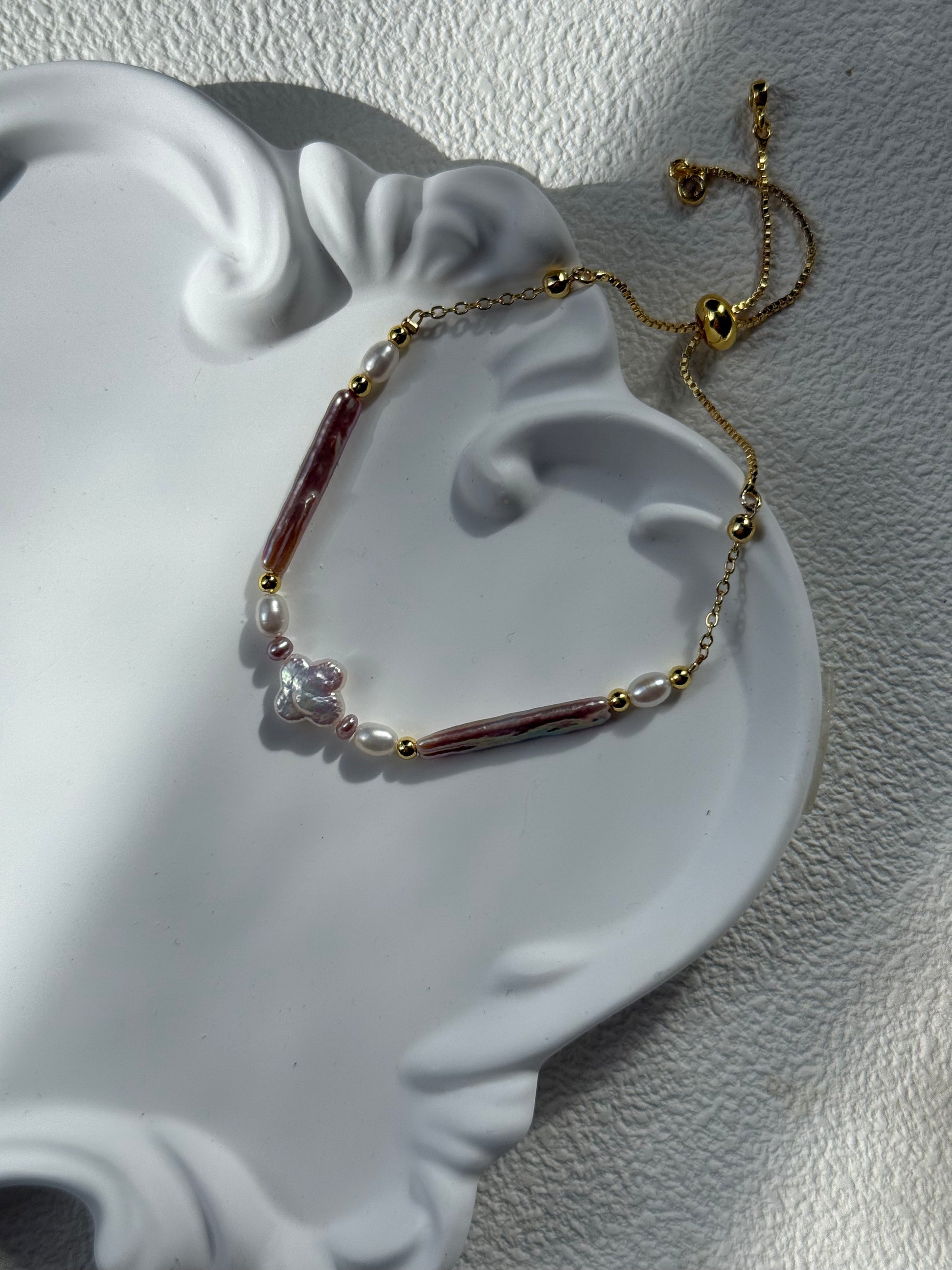 Add a touch of elegance and charm to your wrist with our Purple Baroque Pearl & Clover Charm Bracelet. This unique design features elongated baroque freshwater pearls in a soft purple hue, paired with a four-leaf clover-shaped pearl, luminous white pearls, and gold-plated beads.
