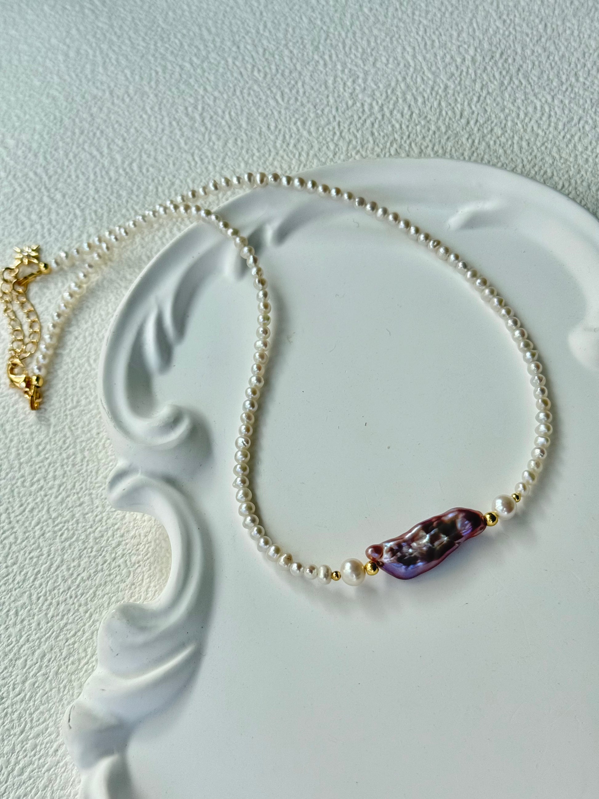 A delicate strand of tiny white freshwater pearls, accented with a single lilac baroque pearl at the center, finished with 18K gold-filled beads for a subtle touch of shine. The minimalist design highlights the uniqueness of the baroque pearl, making it both timeless and modern.