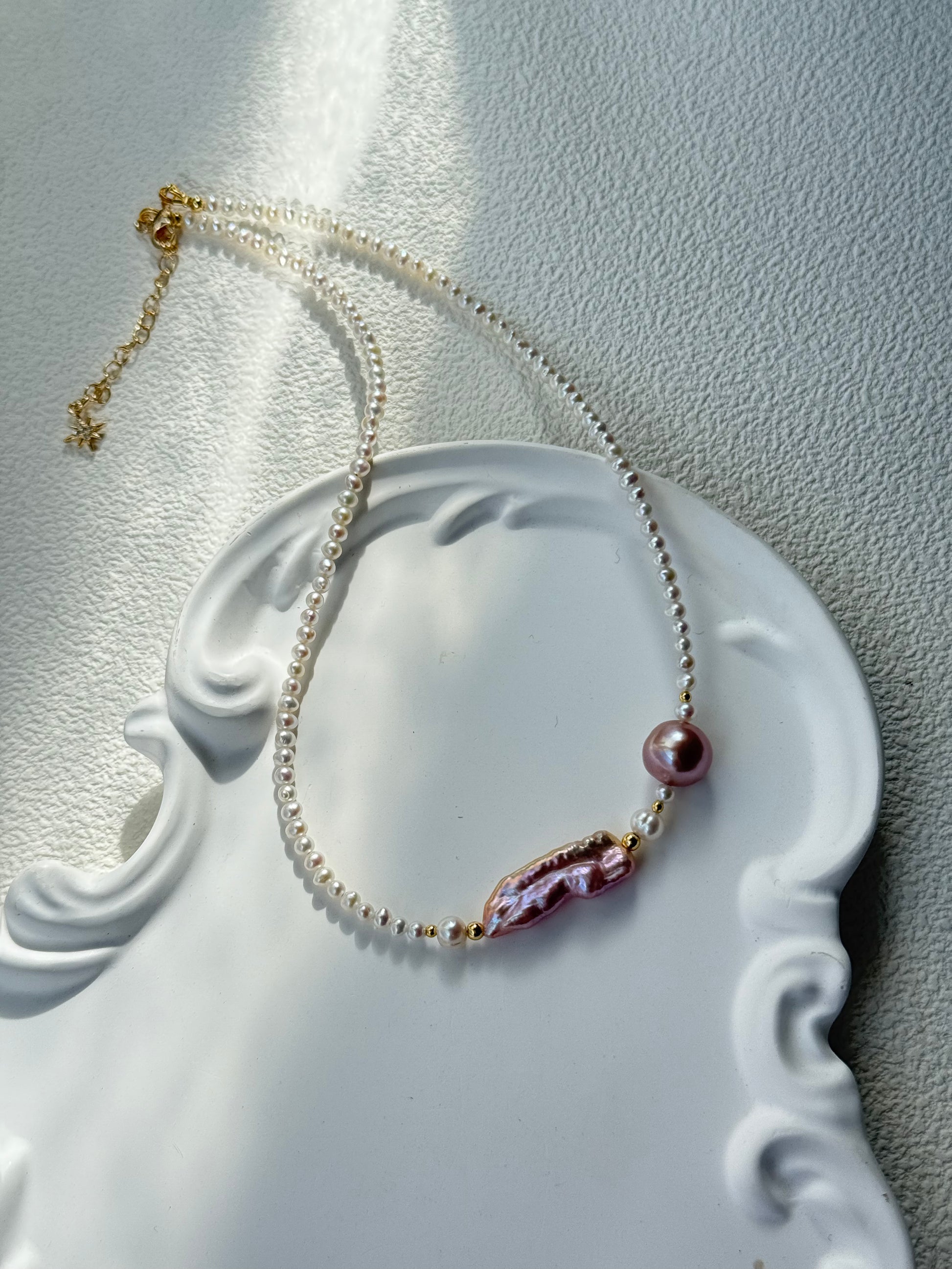 A delicate 16-inch freshwater pearl choker, featuring dainty seed pearls with a luminous pink-purple baroque centerpiece and a round pearl accent. Finished with 18K gold-plated details and an adjustable chain for the perfect fit.