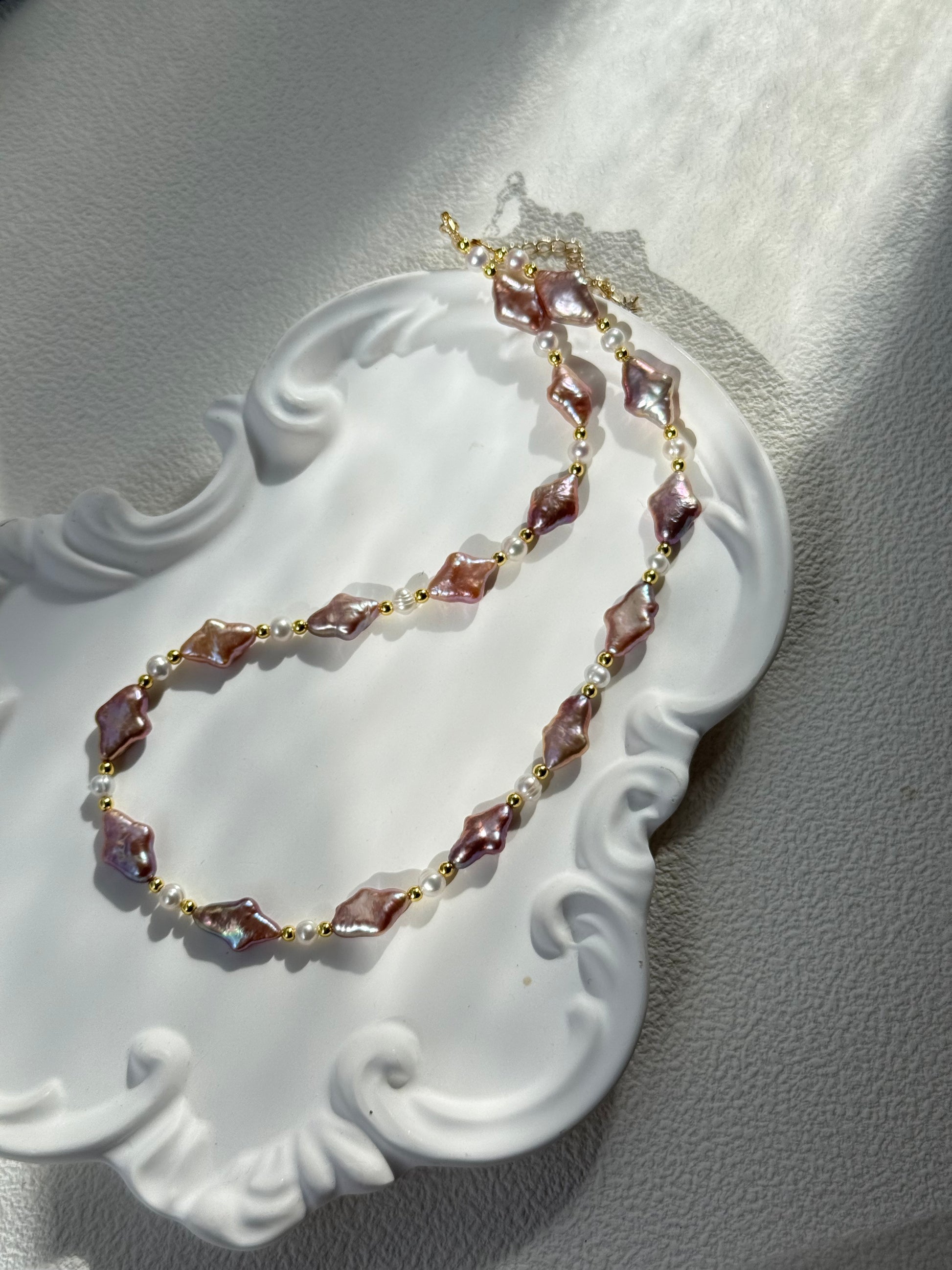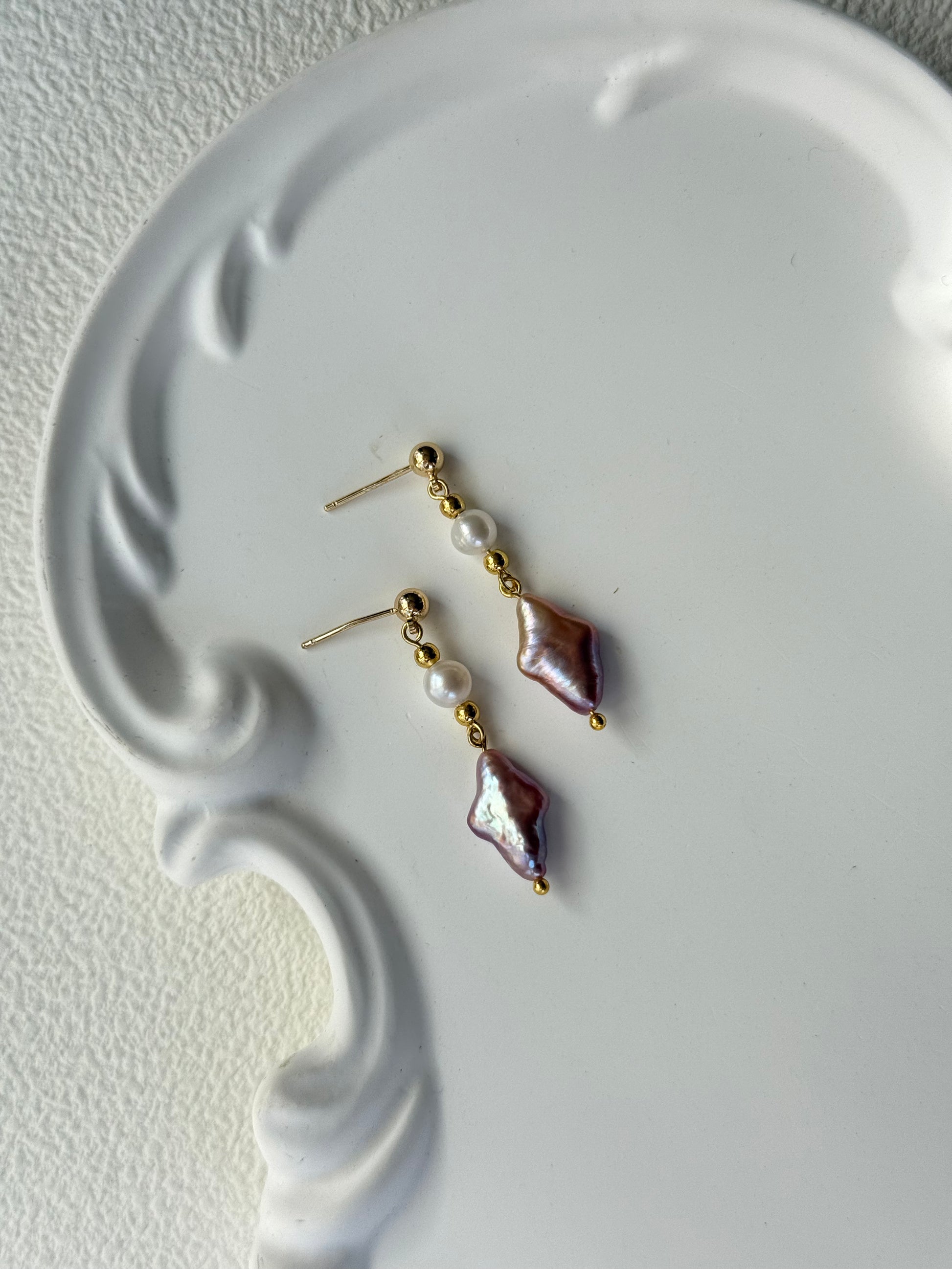 Pearl type: Purple cross-shaped baroque pearls, white round freshwater pearls