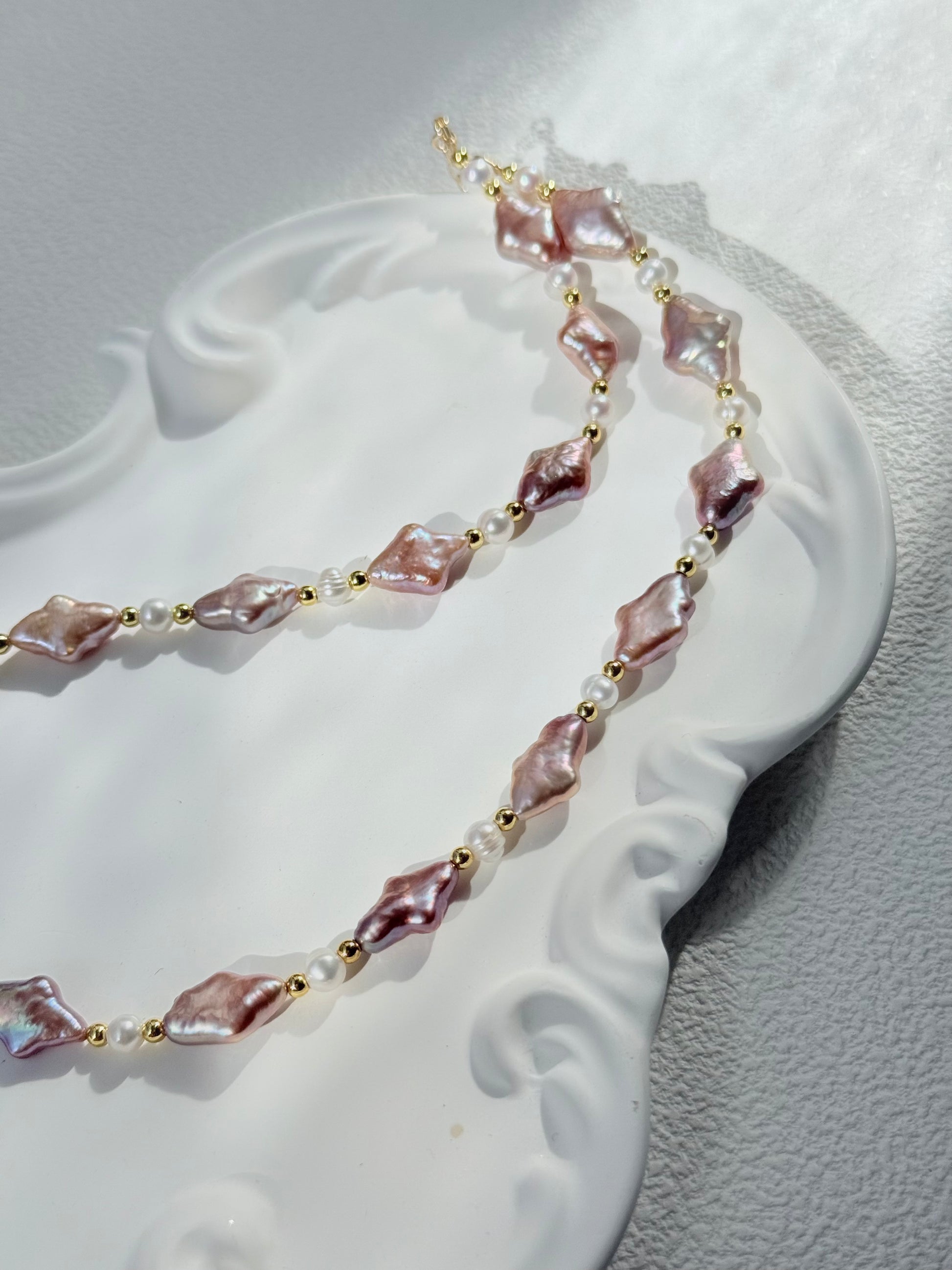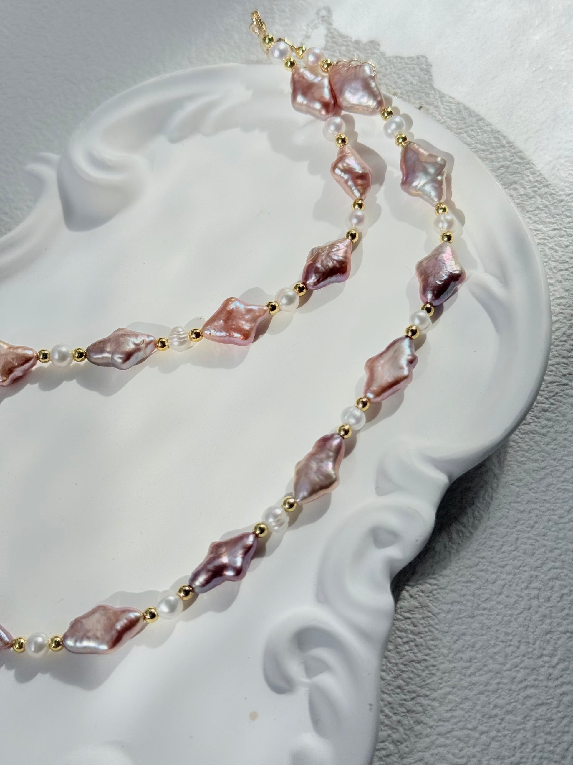 This stunning set features rare purple cross-shaped baroque pearls, shimmering with an iridescent glow that shifts between lilac and deep violet under the light. Paired with white freshwater pearls and 18K gold-filled beads, the design balances elegance with a celestial, statement-making style.