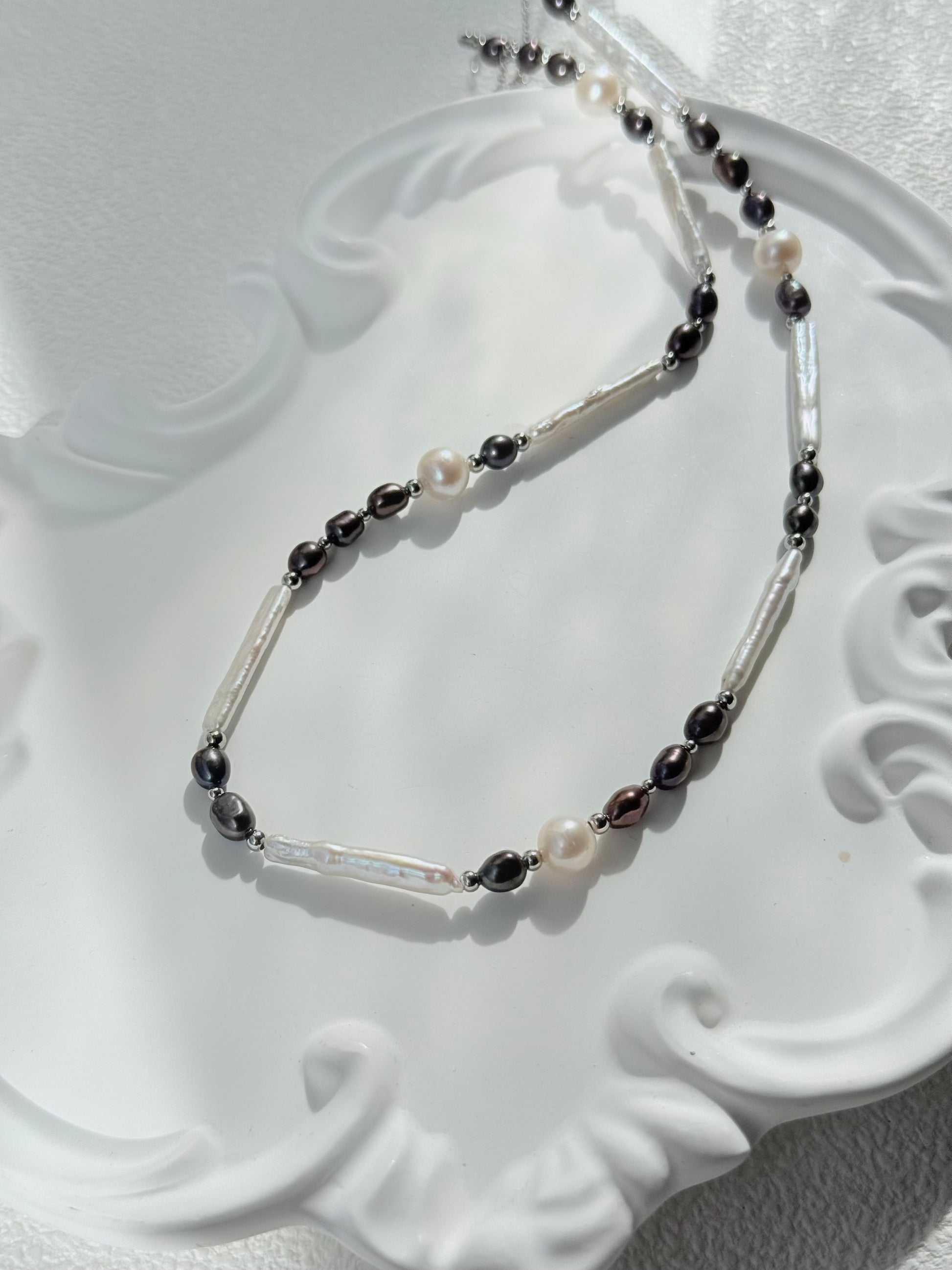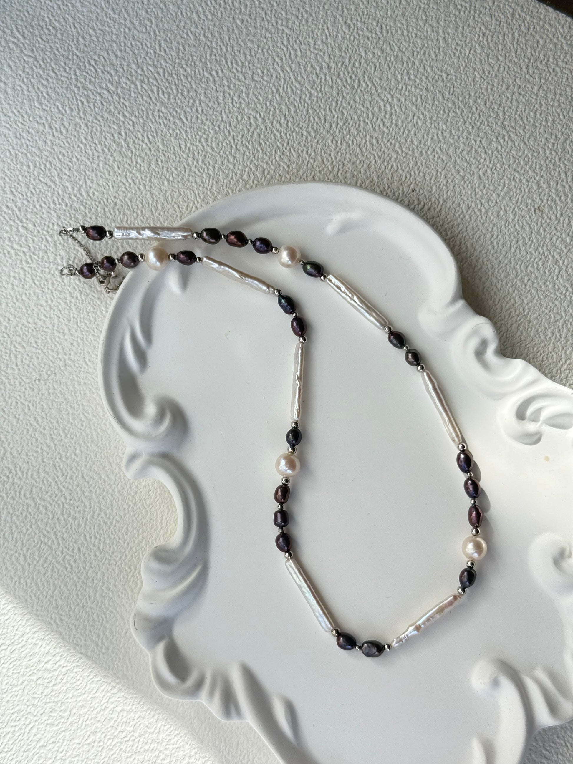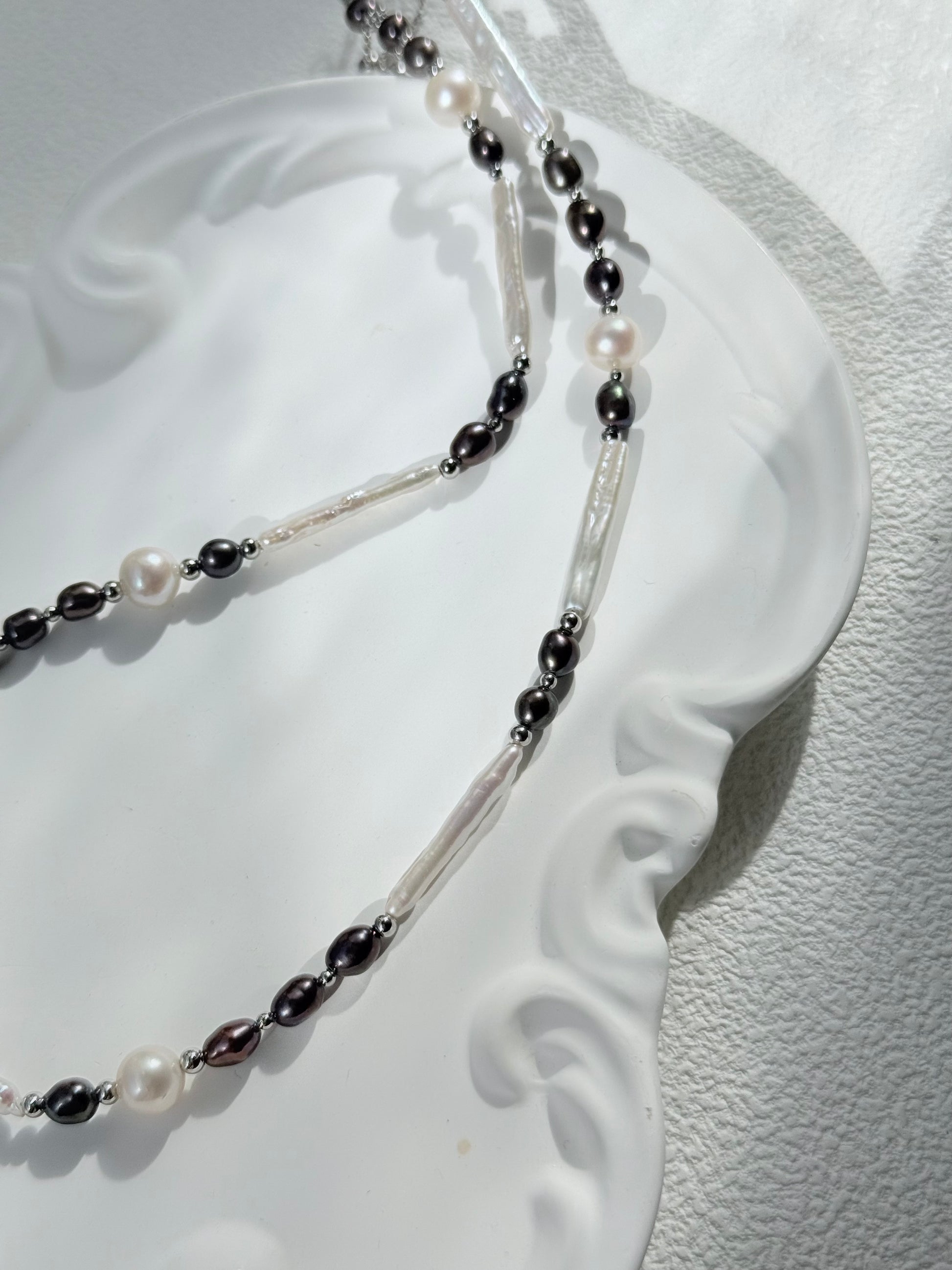 Featuring black freshwater pearls contrasted with white pearls and lustrous stick pearls, highlighted by silver spacers. A bold and chic design that shines with midnight elegance.