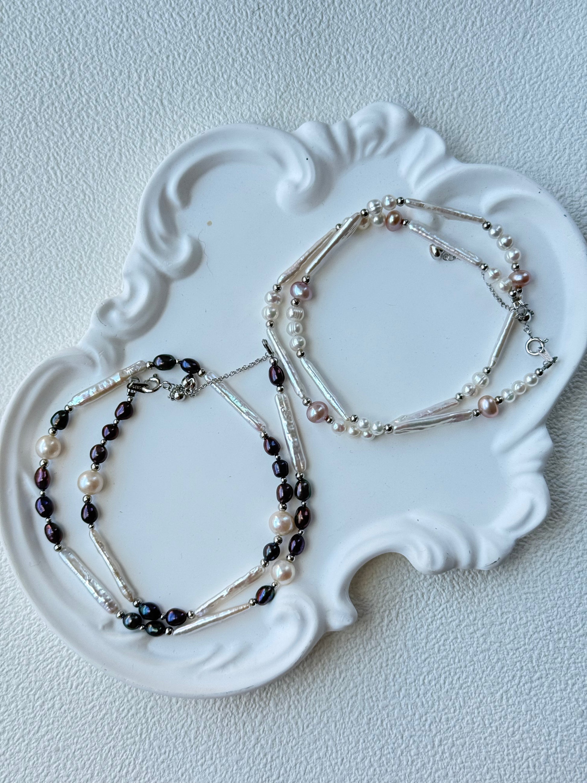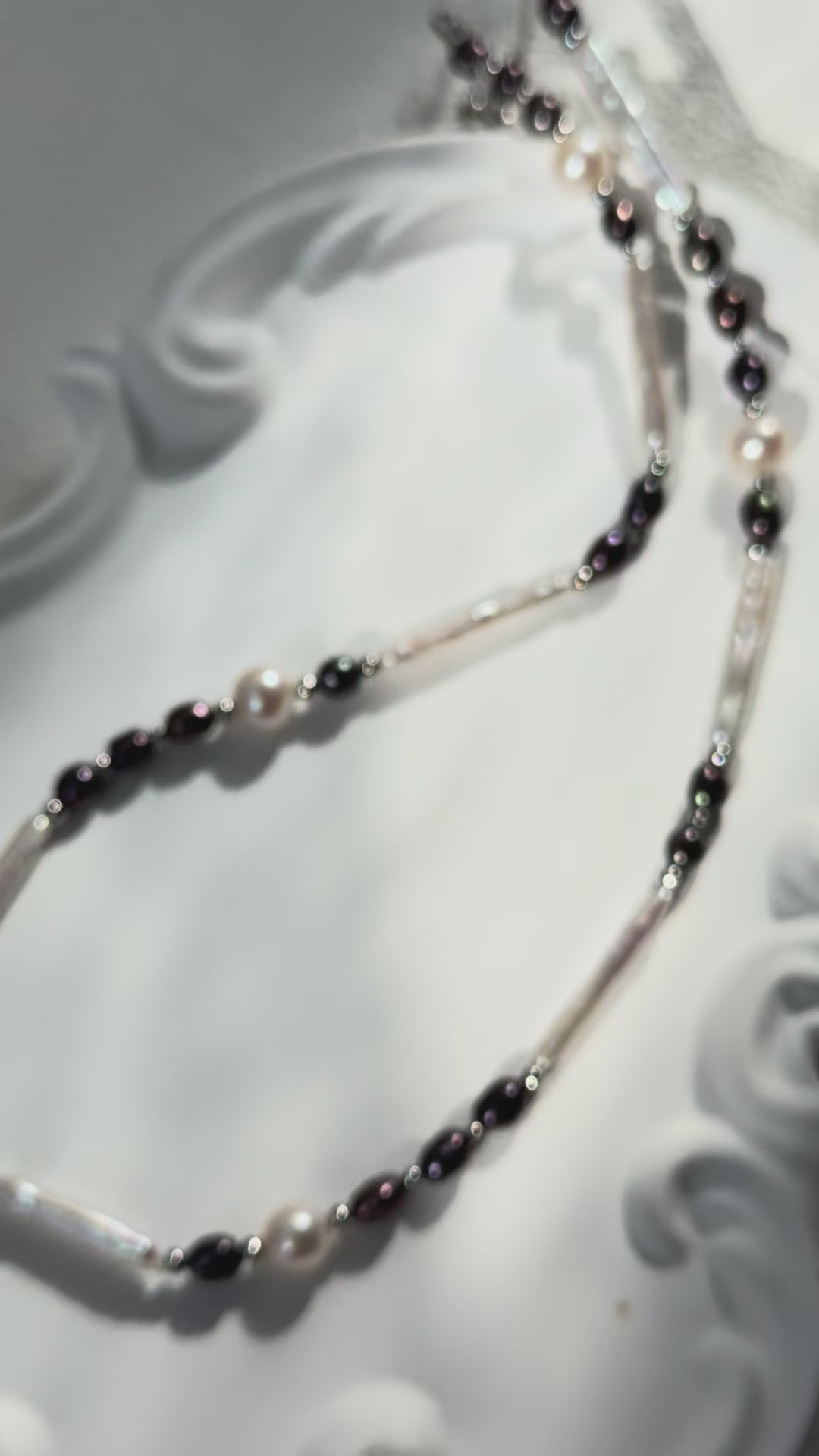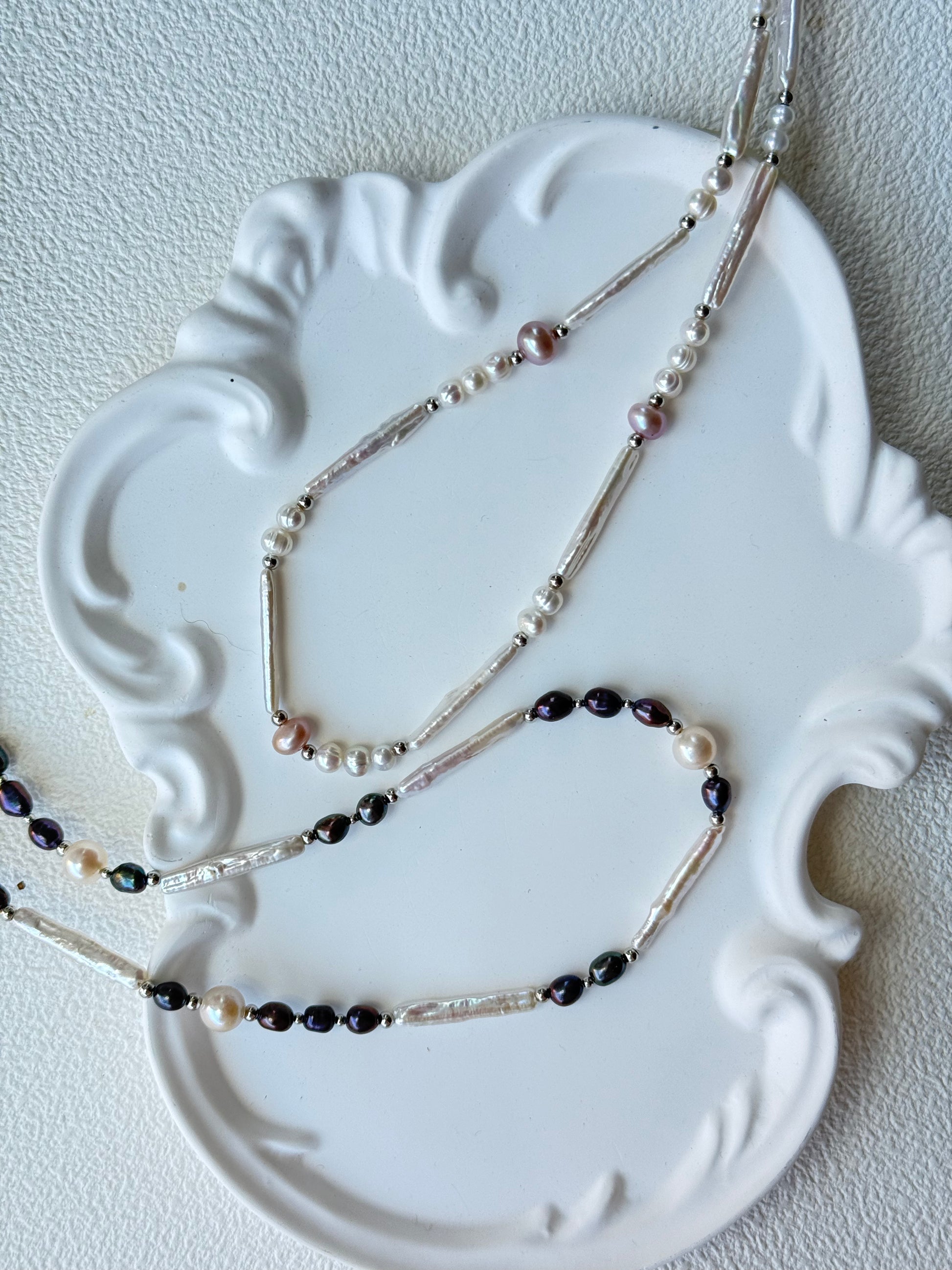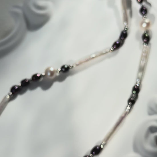 Featuring black freshwater pearls contrasted with white pearls and lustrous stick pearls, highlighted by silver spacers. A bold and chic design that shines with midnight elegance.
