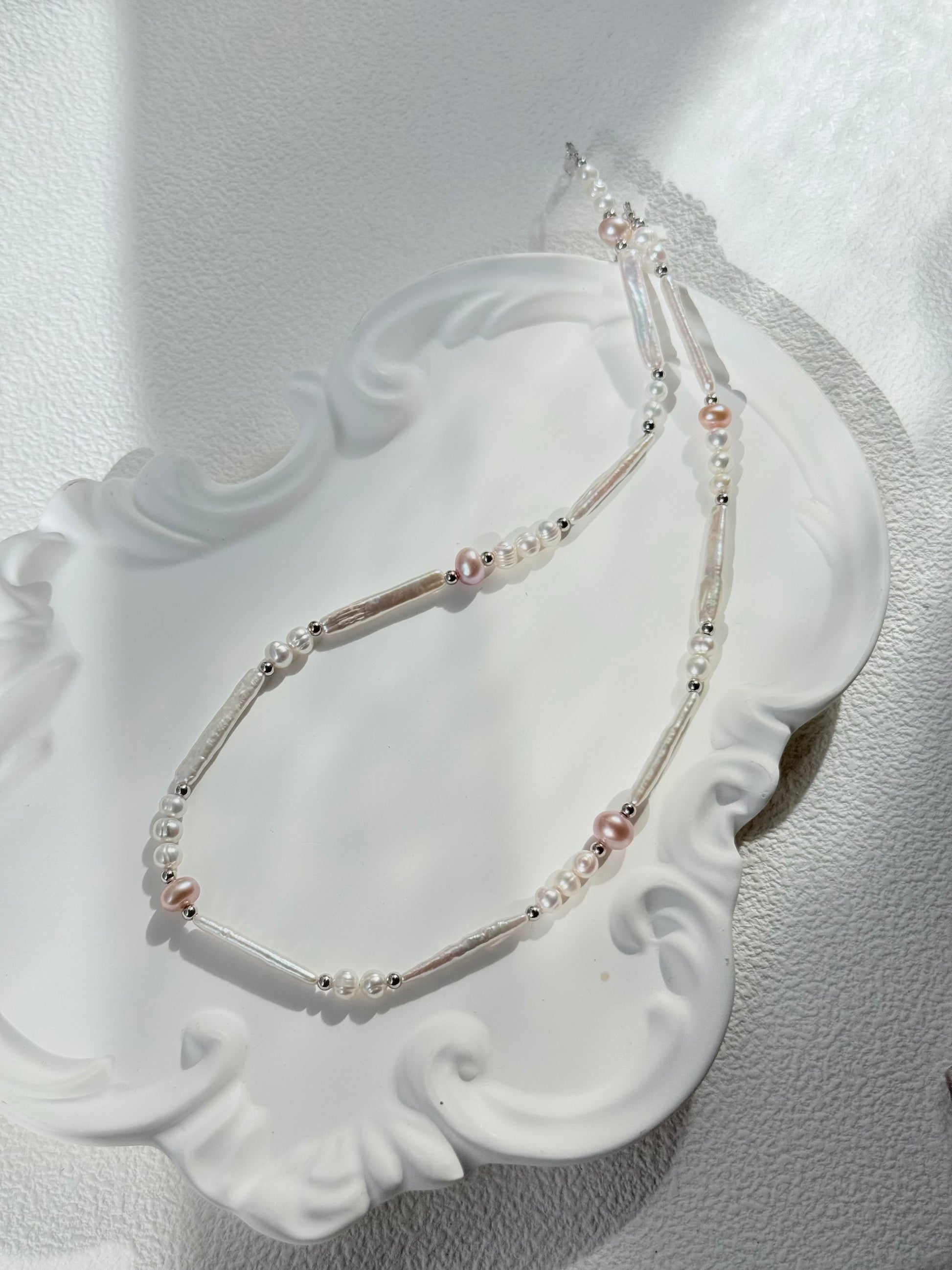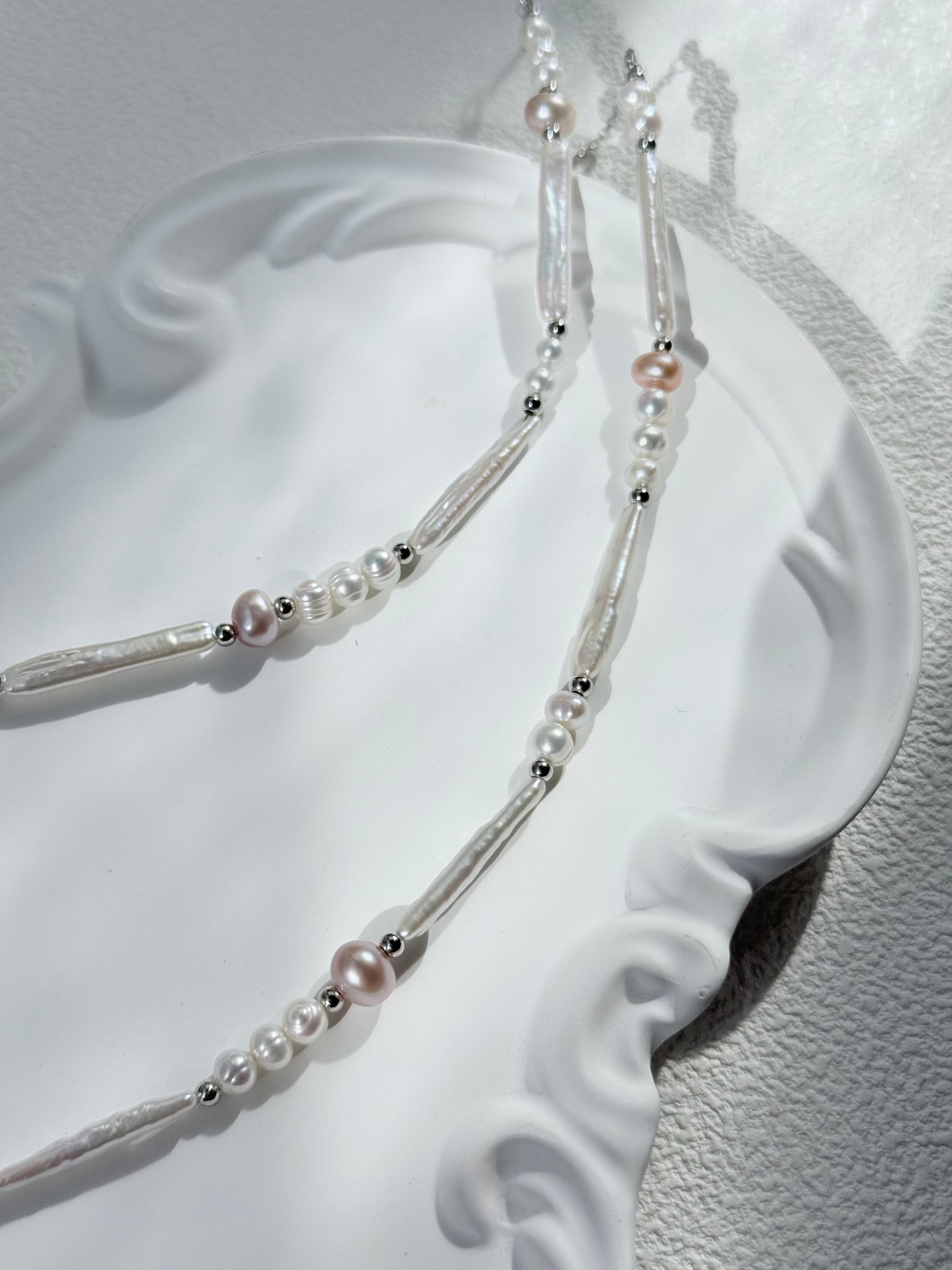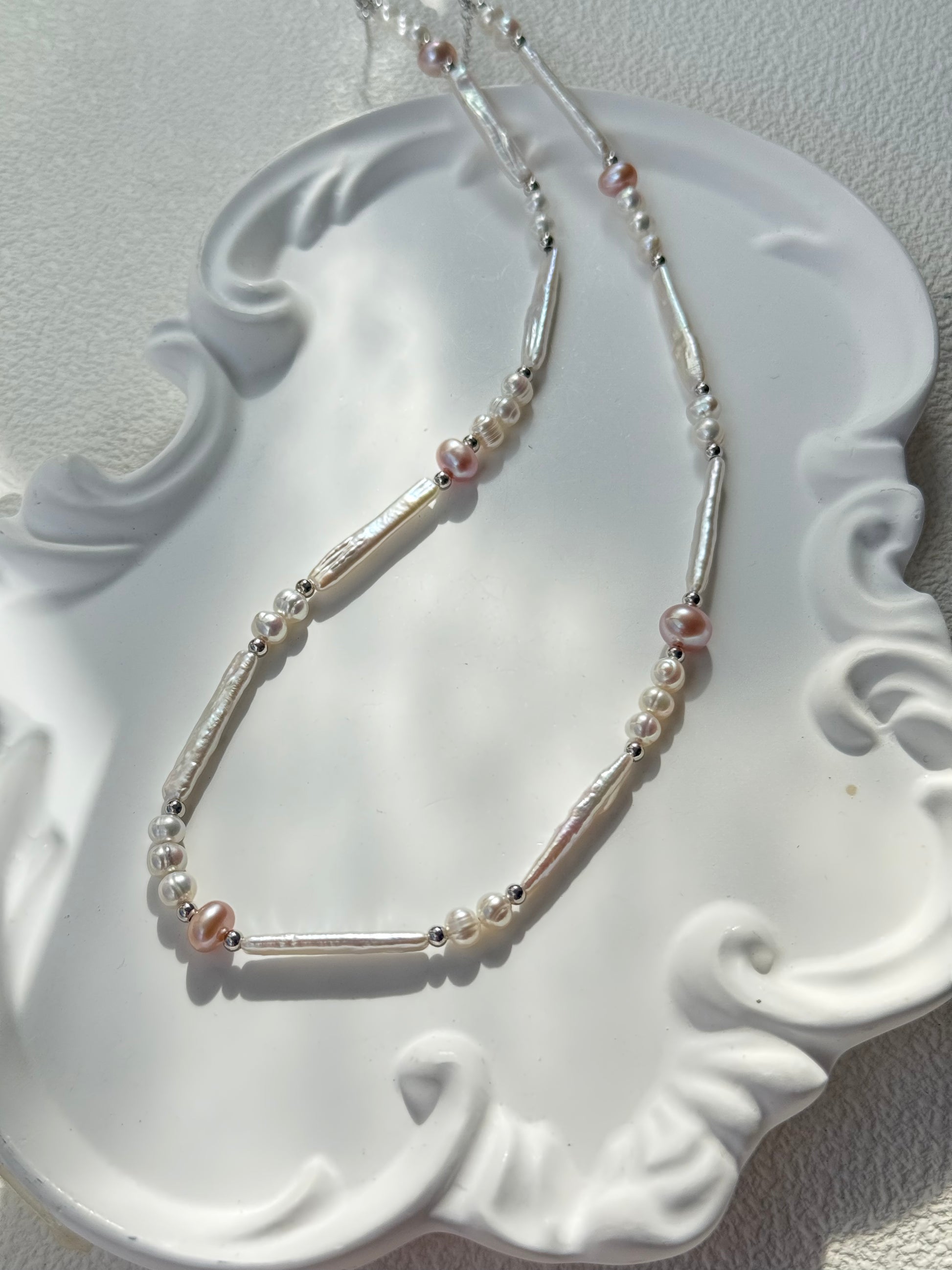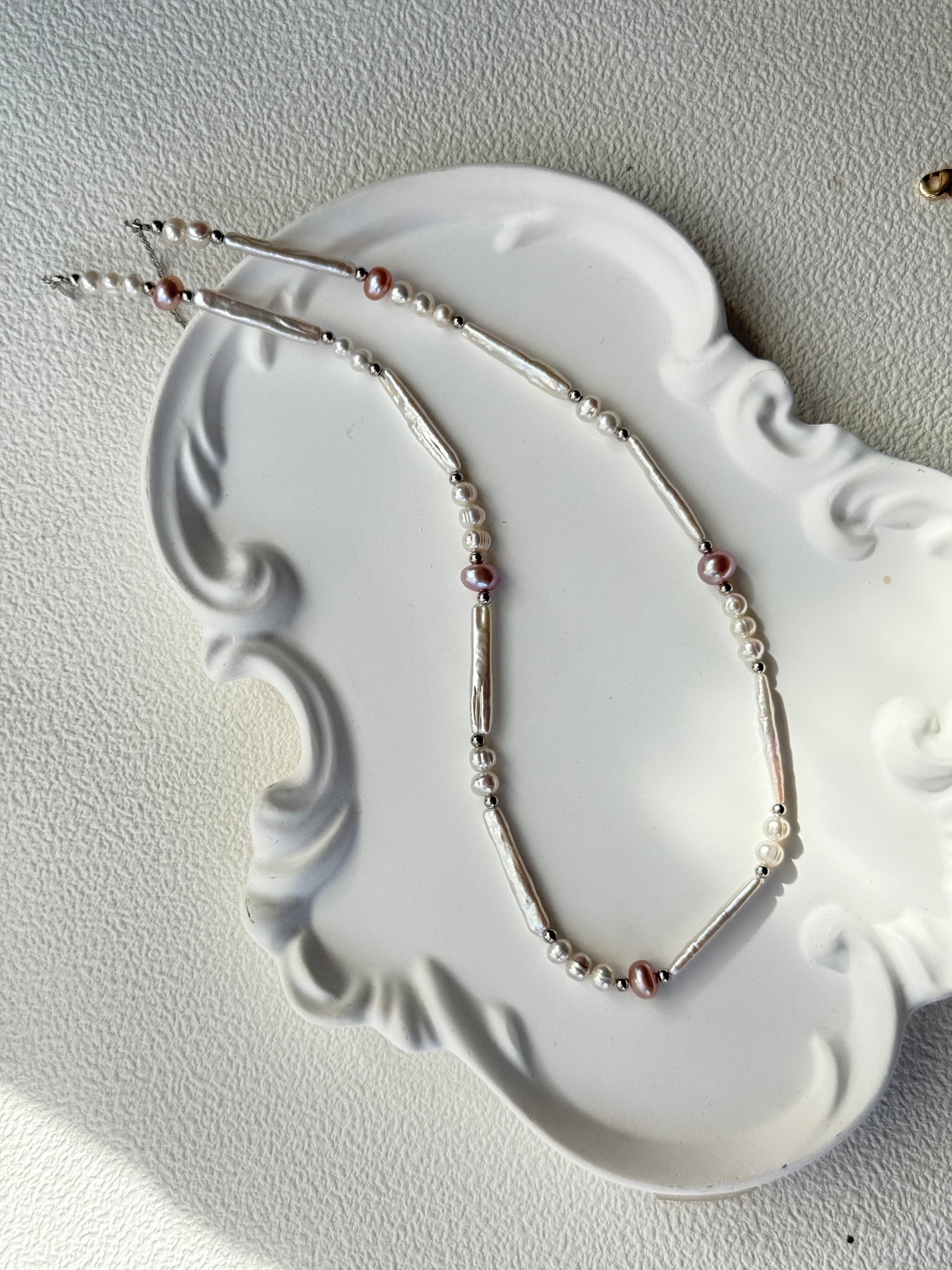 A delicate mix of white pearls, soft pink freshwater pearls, and ivory stick pearls, accented with silver-plated beads. Romantic yet modern, just like a silver rose under moonlight.