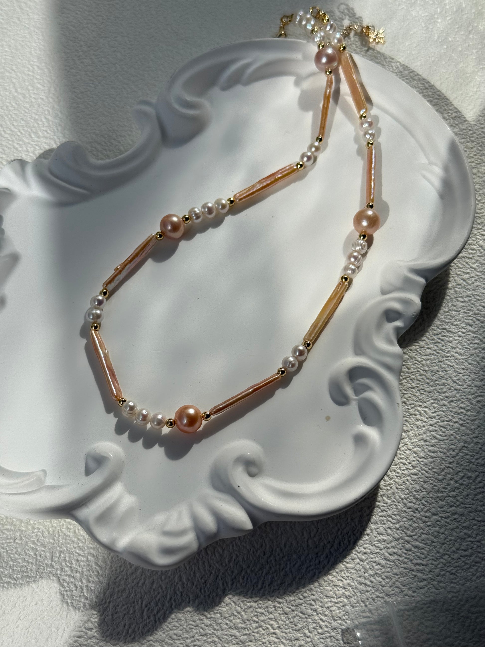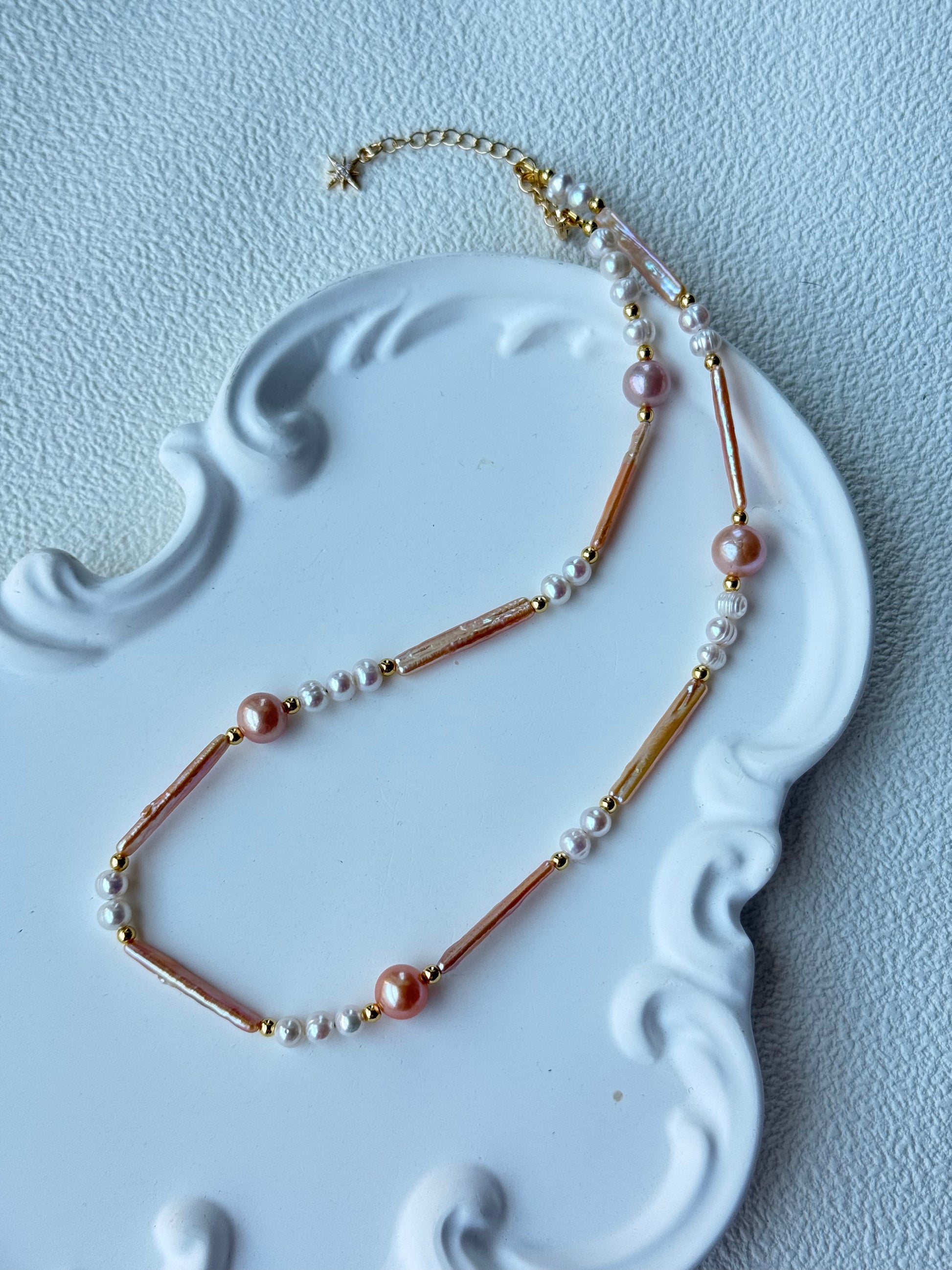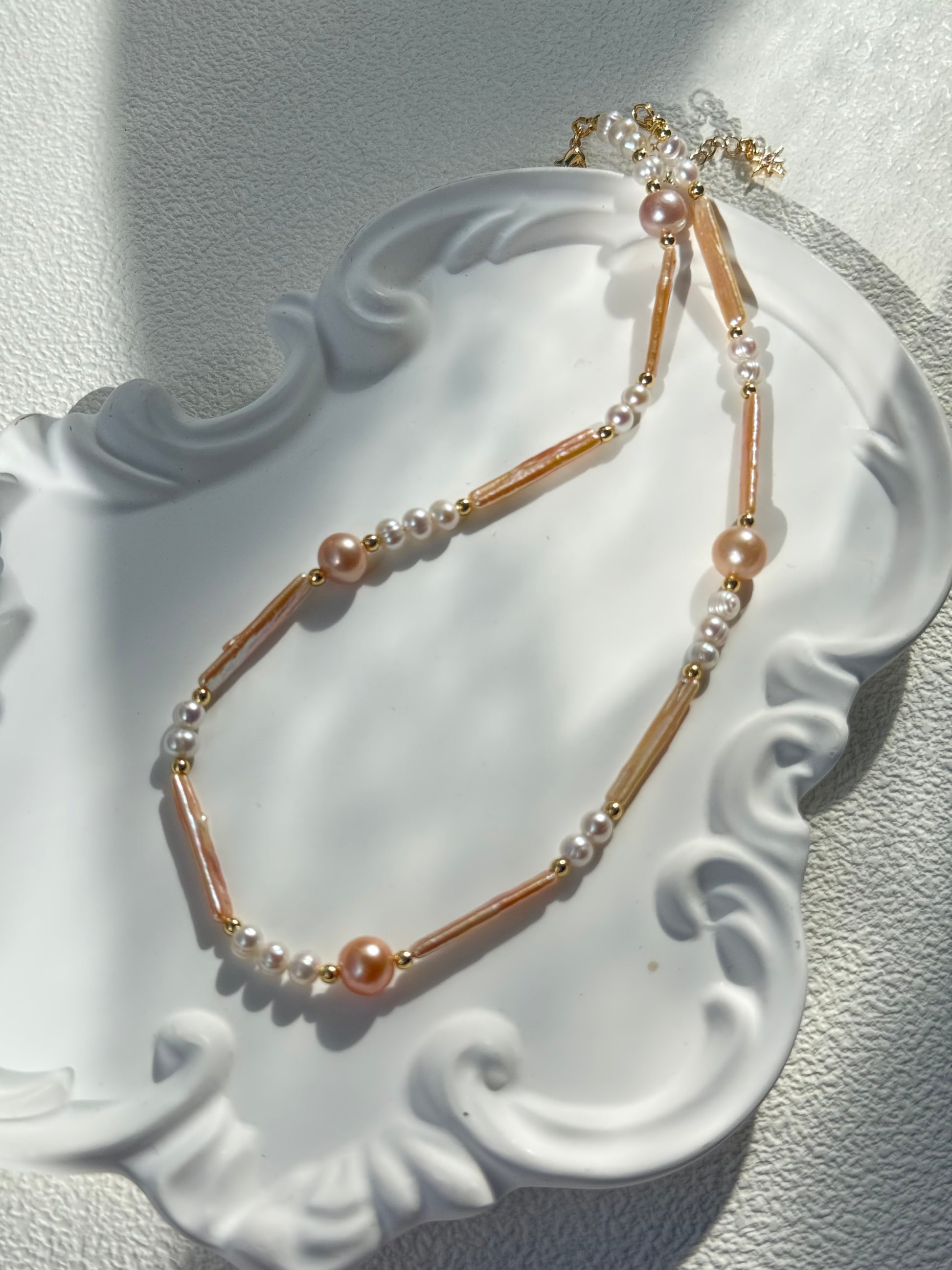 A radiant blend of white freshwater pearls, peach-toned stick pearls, and 18K gold-filled beads, creating a warm golden glow that feels like the first light of dawn.