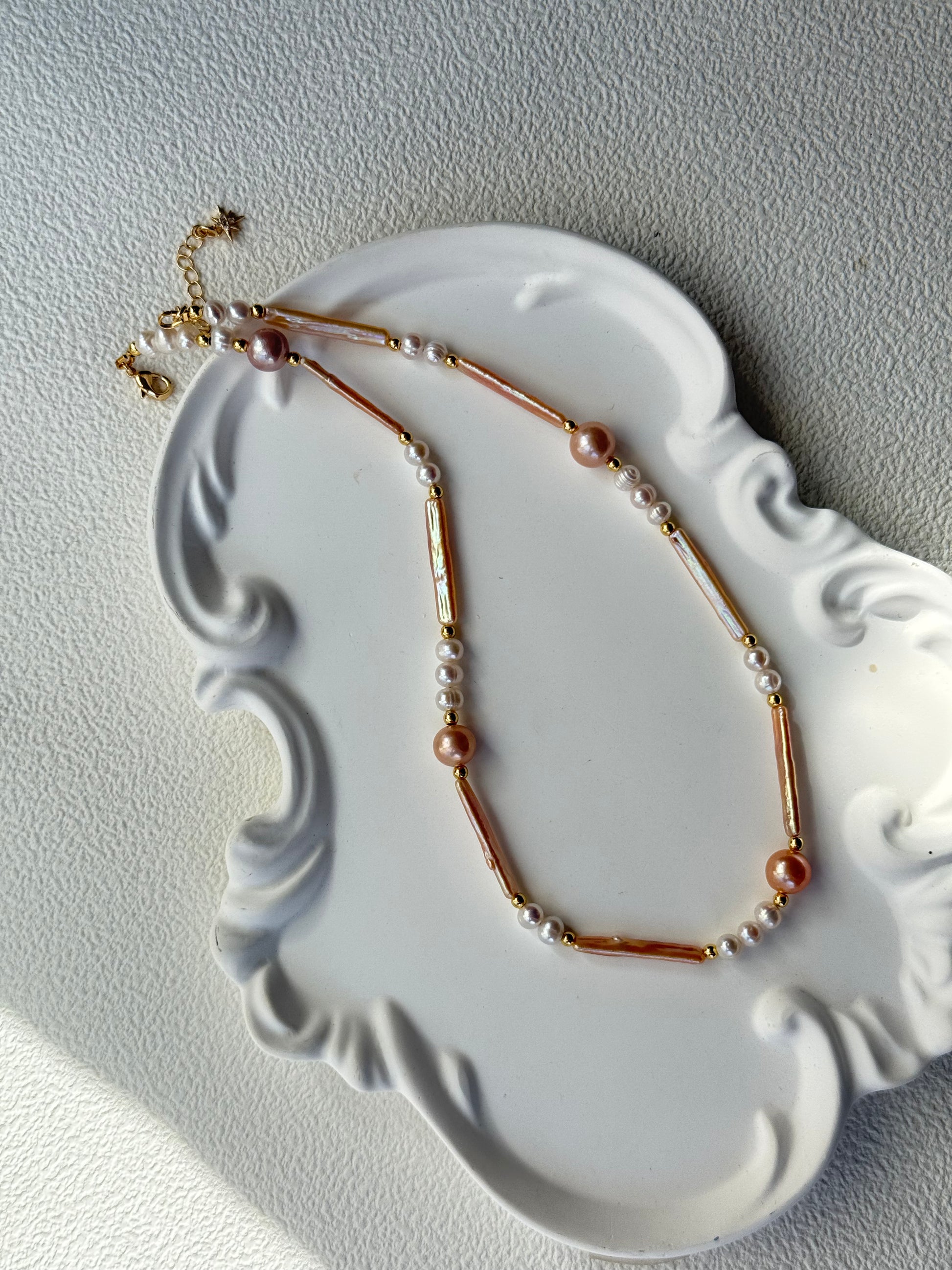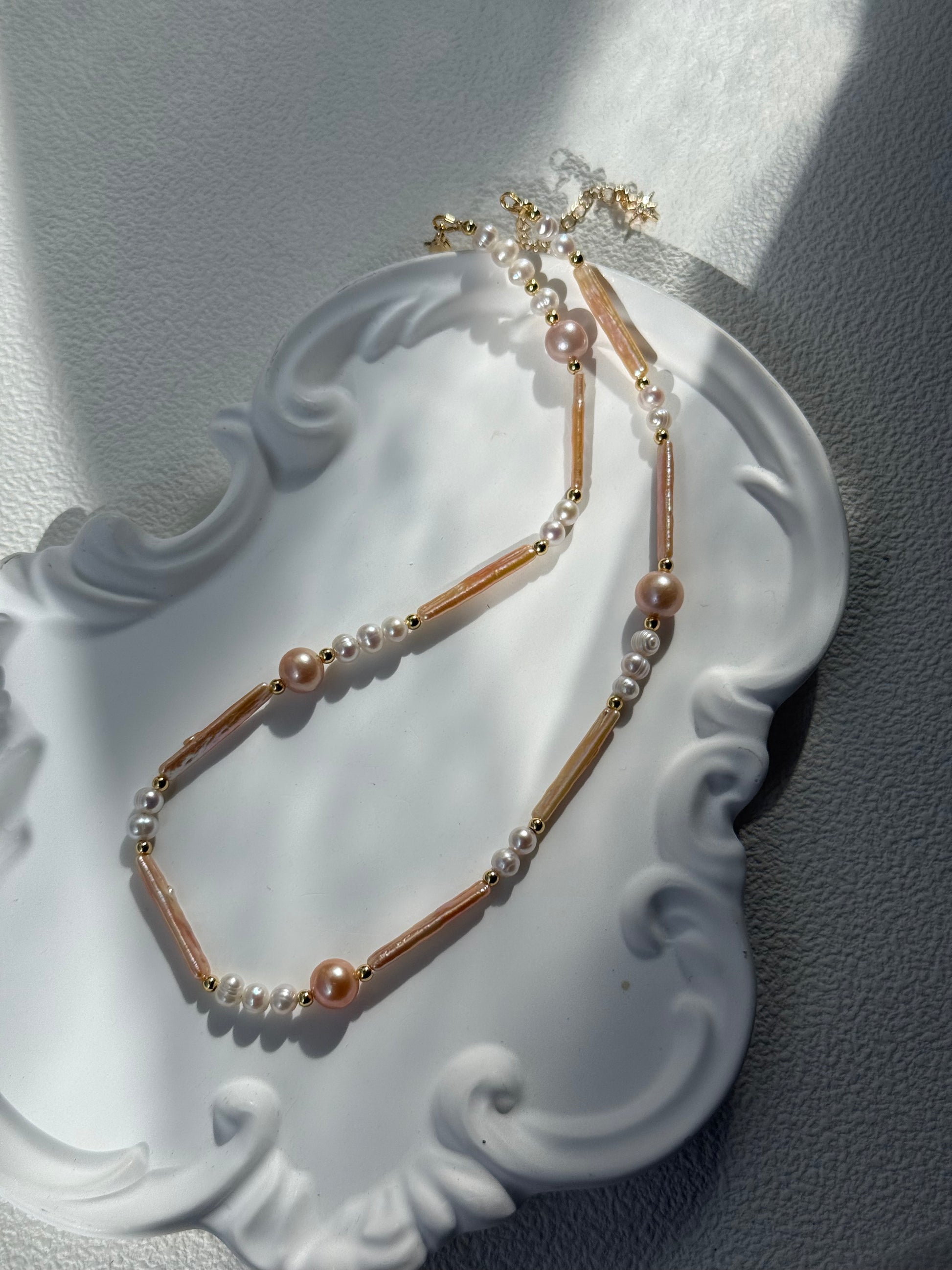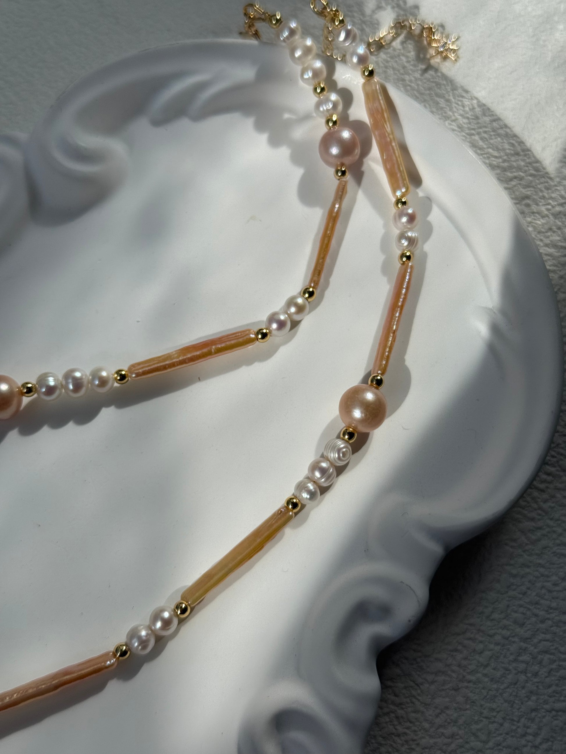 A radiant blend of white freshwater pearls, peach-toned stick pearls, and 18K gold-filled beads, creating a warm golden glow that feels like the first light of dawn.